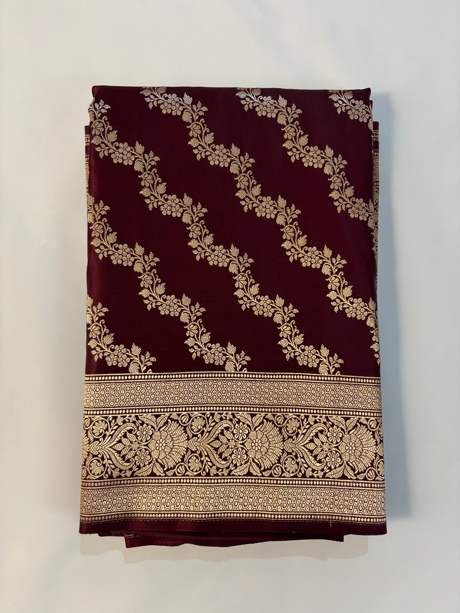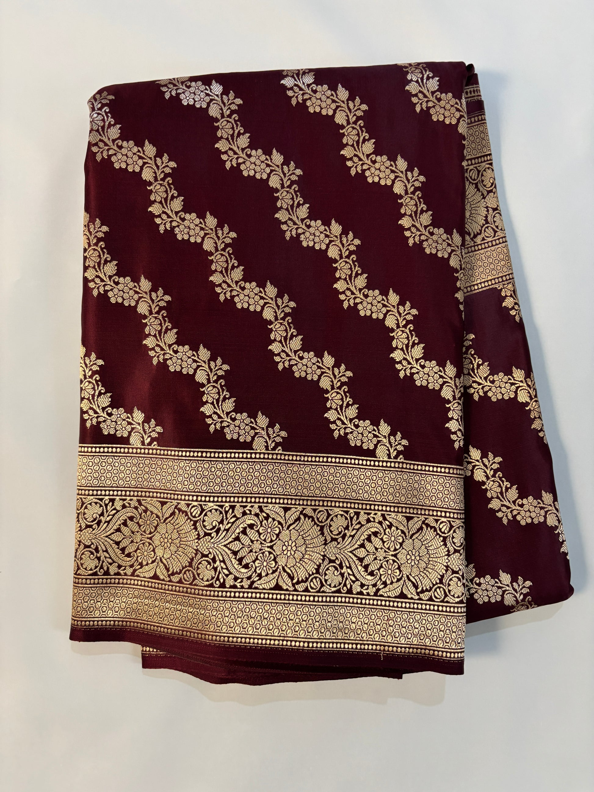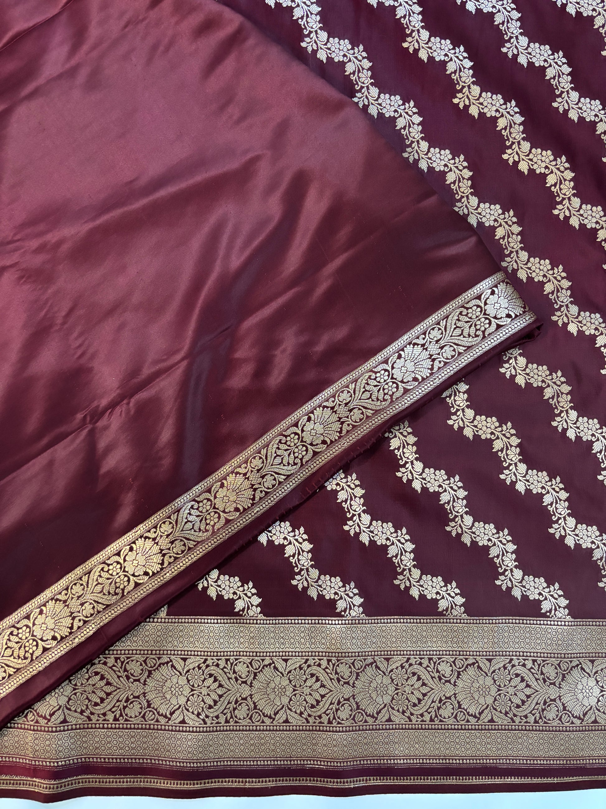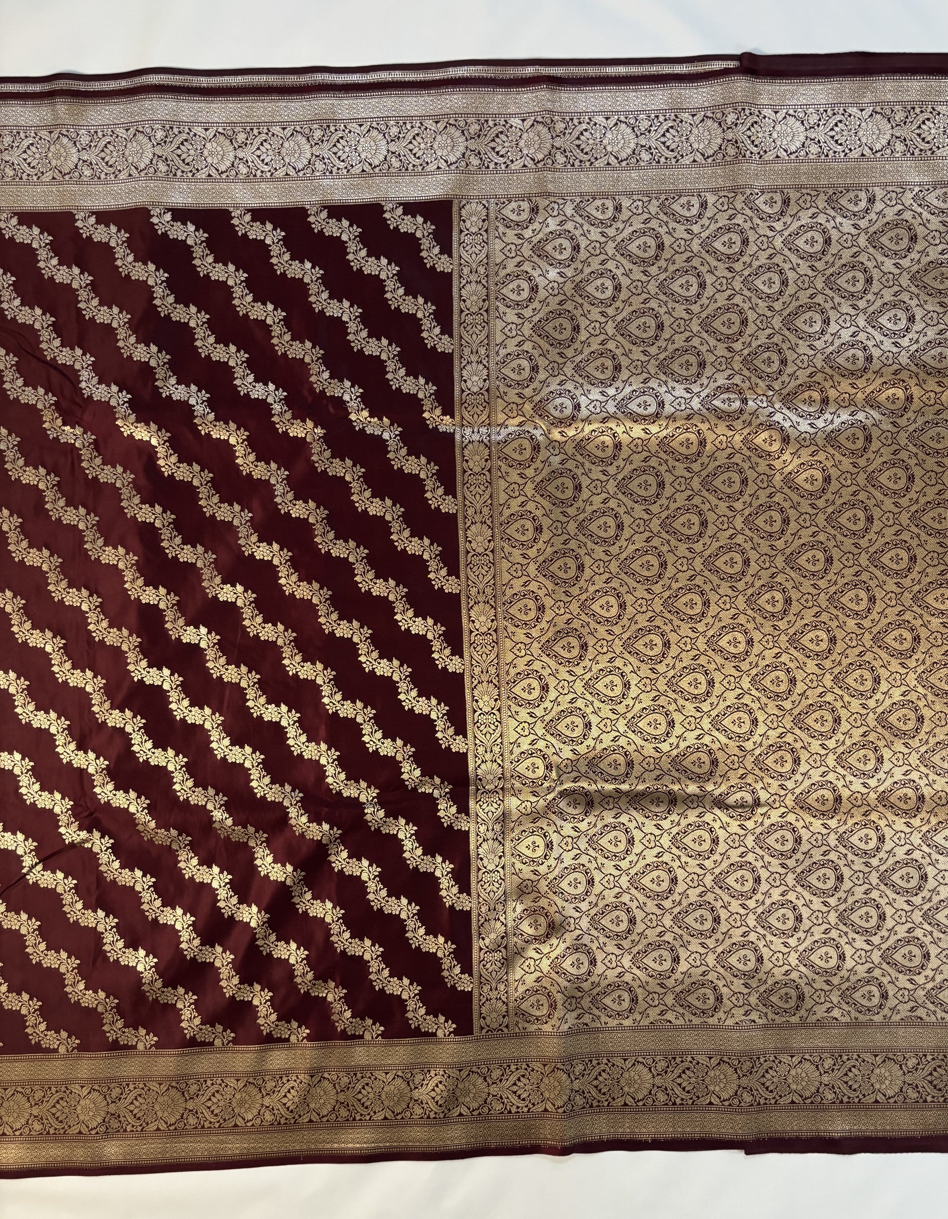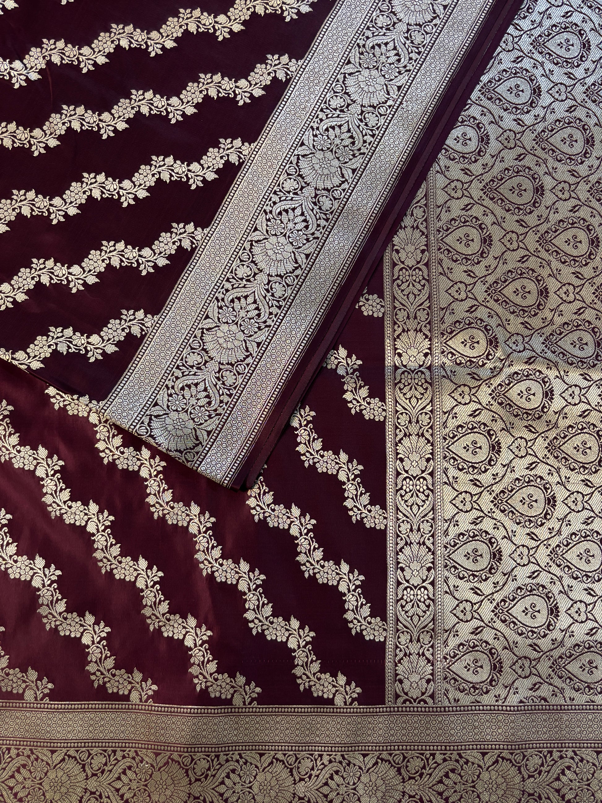 Dark Coffee brown shade Banarasi silk saree, beautifully adorned with intricate golden floral zari weaving.