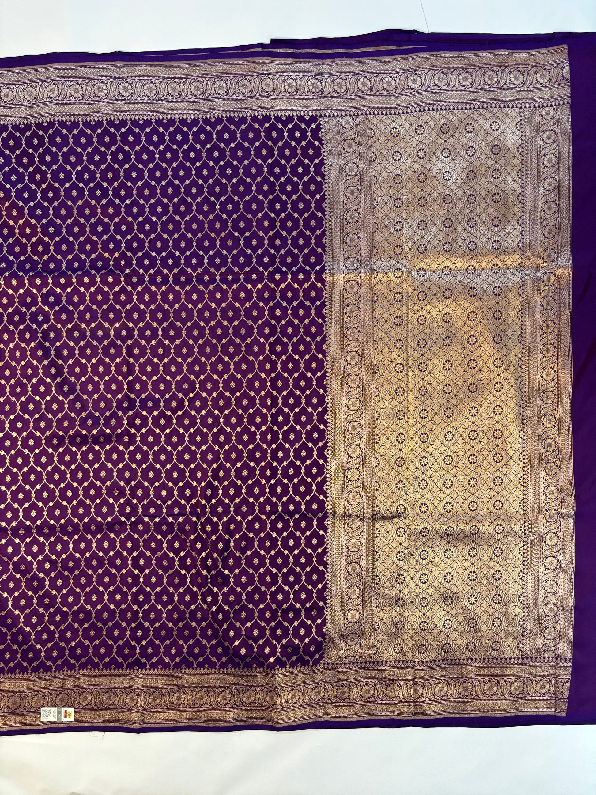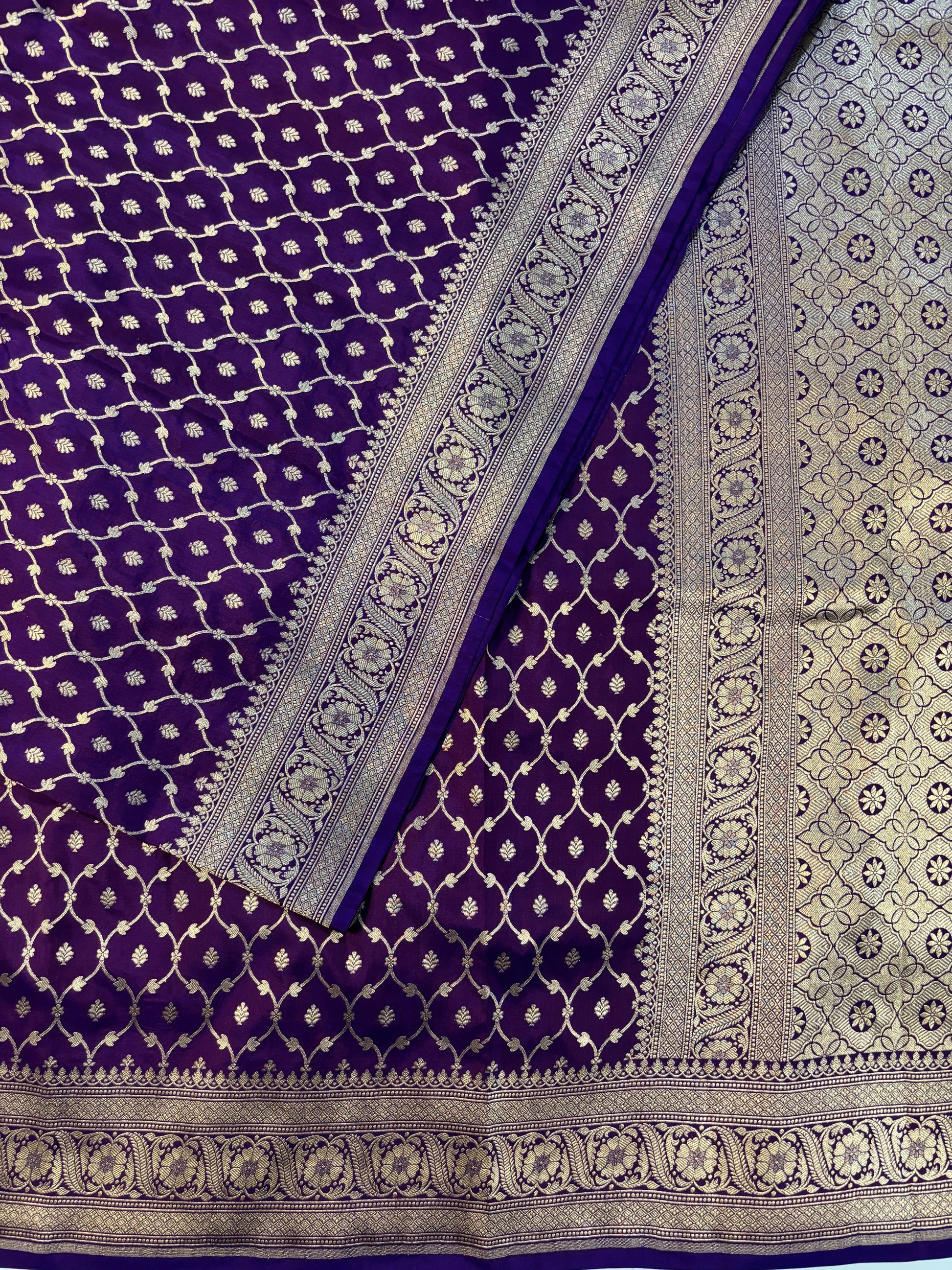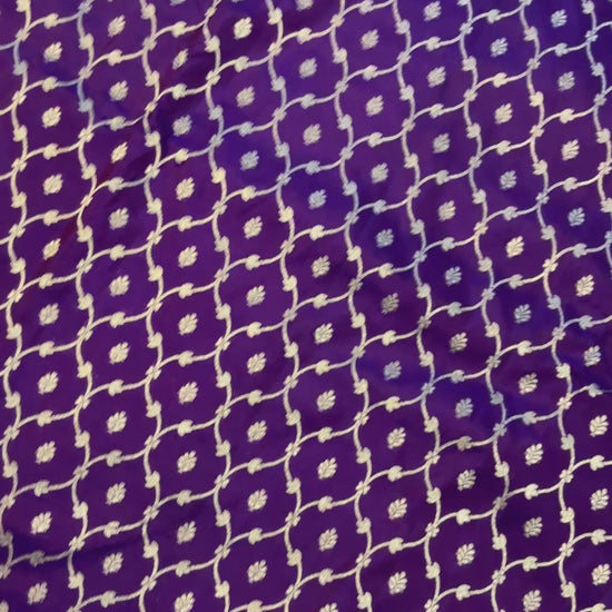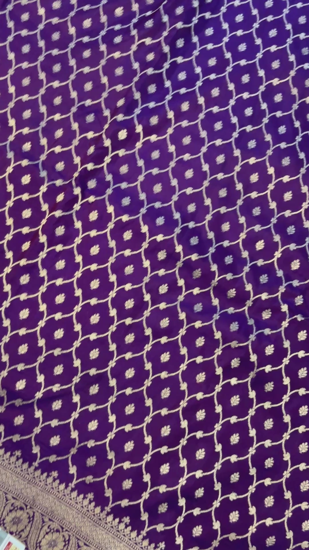Royal Purple Banarasi Silk Saree - Drape yourself in timeless elegance with this rich purple Banarasi silk saree, adorned with intricate golden zari weaving all over. The classic floral motifs and broad border make it a perfect pick for weddings, festive occasions, and grand celebrations. A piece that speaks of tradition with a regal charm