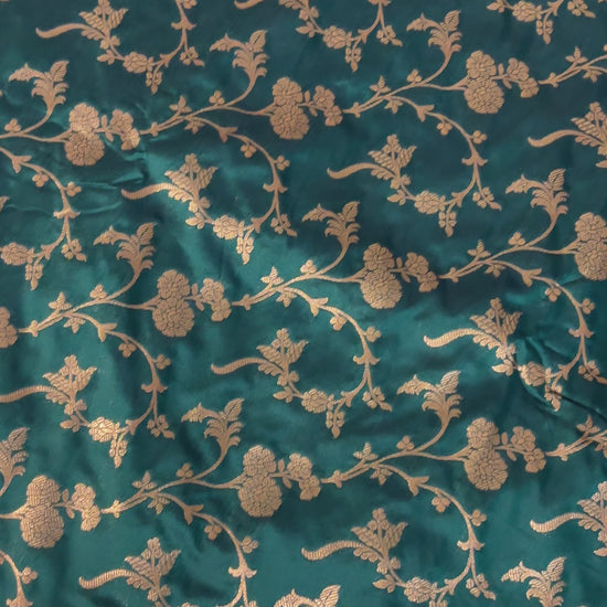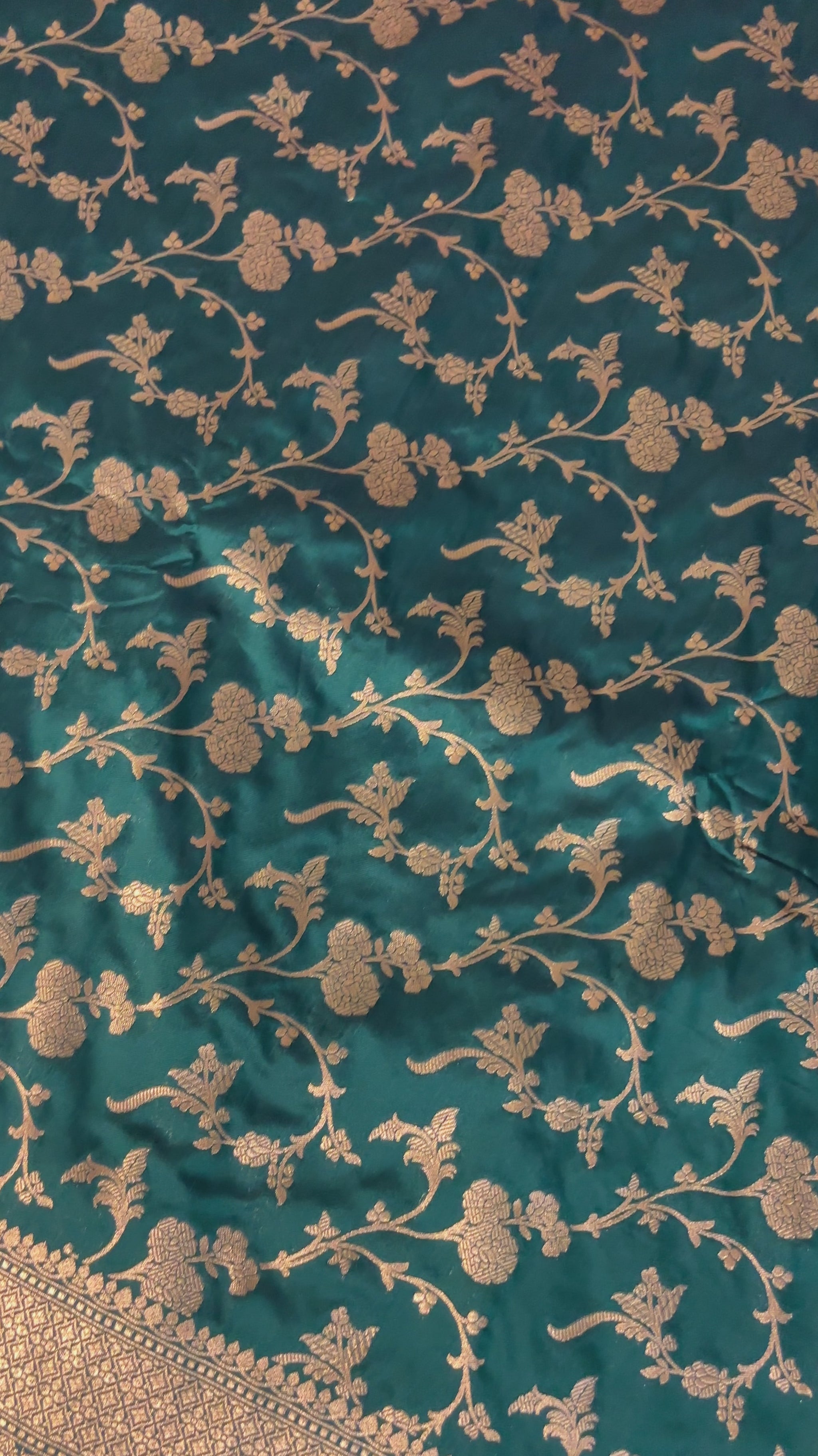 Teal Green Banarasi Silk Saree, Grace meets grandeur in this teal green Banarasi silk saree, featuring exquisite golden floral zari work and a finely detailed border. The luxurious fabric and delicate craftsmanship make it a statement piece for any celebration. A saree that blends tradition with sophistication.
