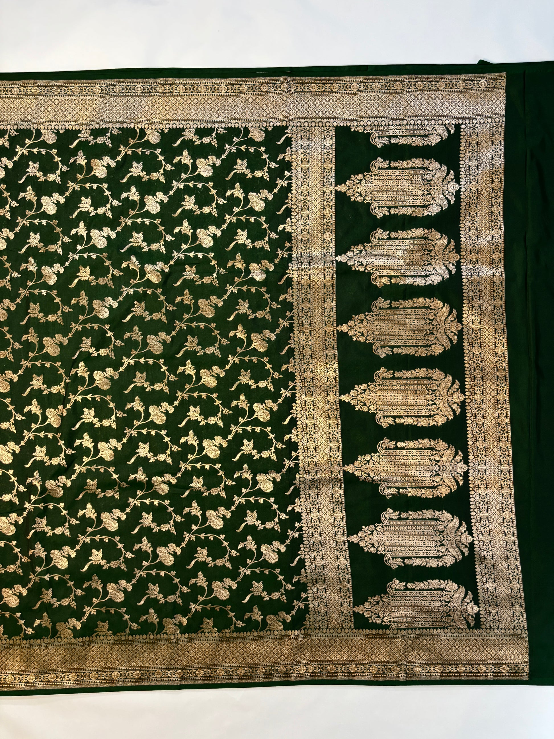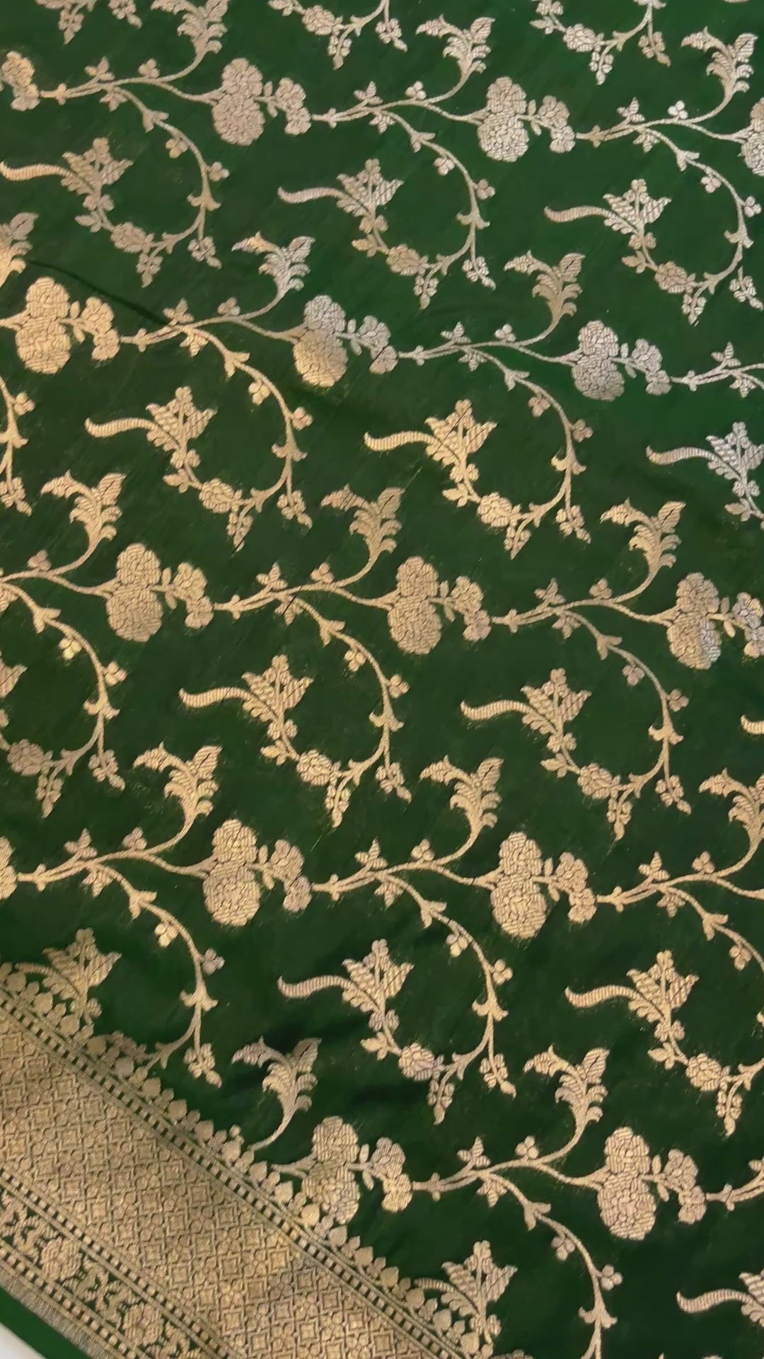 Dark Green Banarasi Silk Saree, Grace meets grandeur in this green Banarasi silk saree, featuring exquisite golden floral zari work and a finely detailed border. The luxurious fabric and delicate craftsmanship make it a statement piece for any celebration. A saree that blends tradition with sophistication.