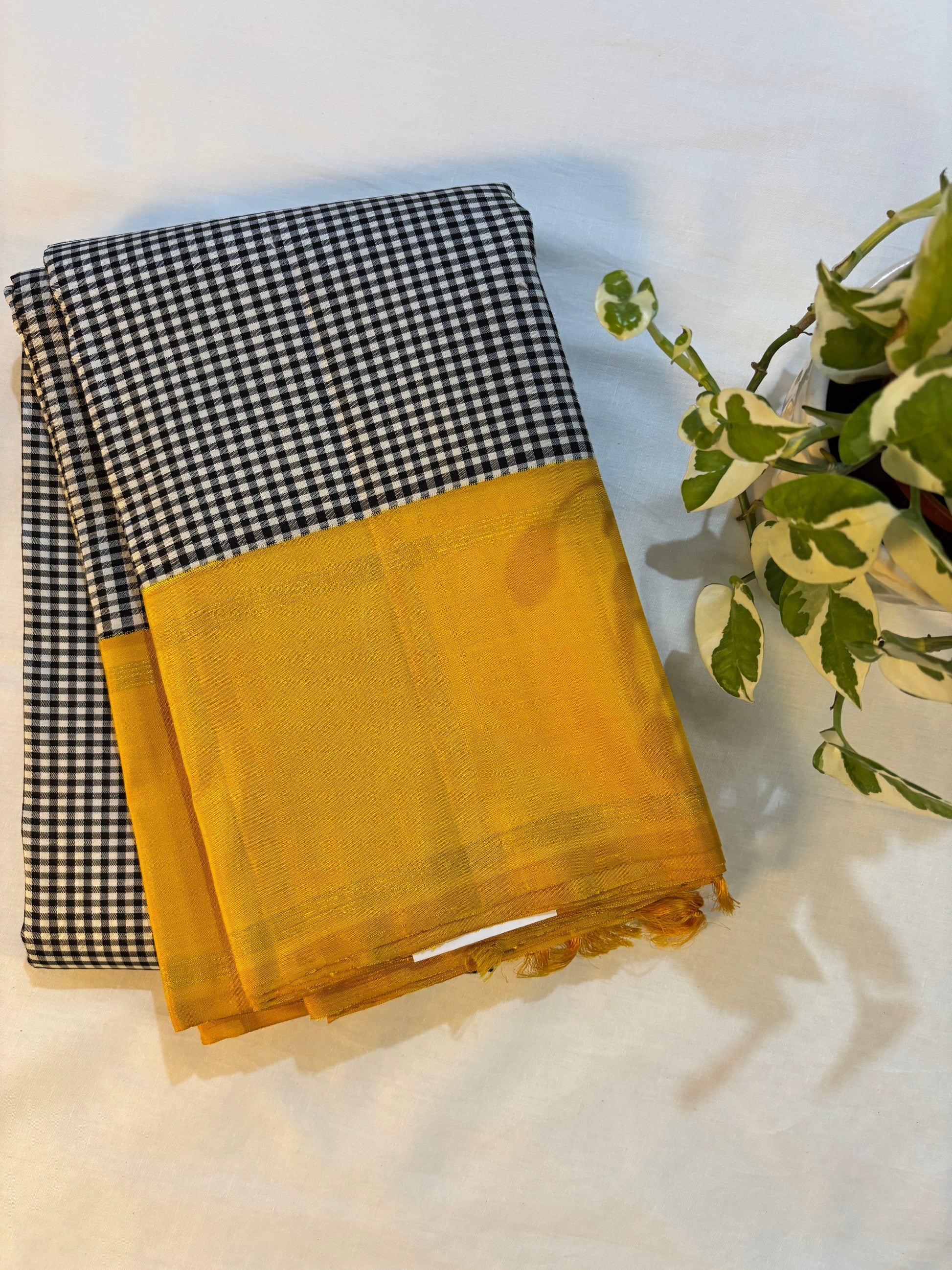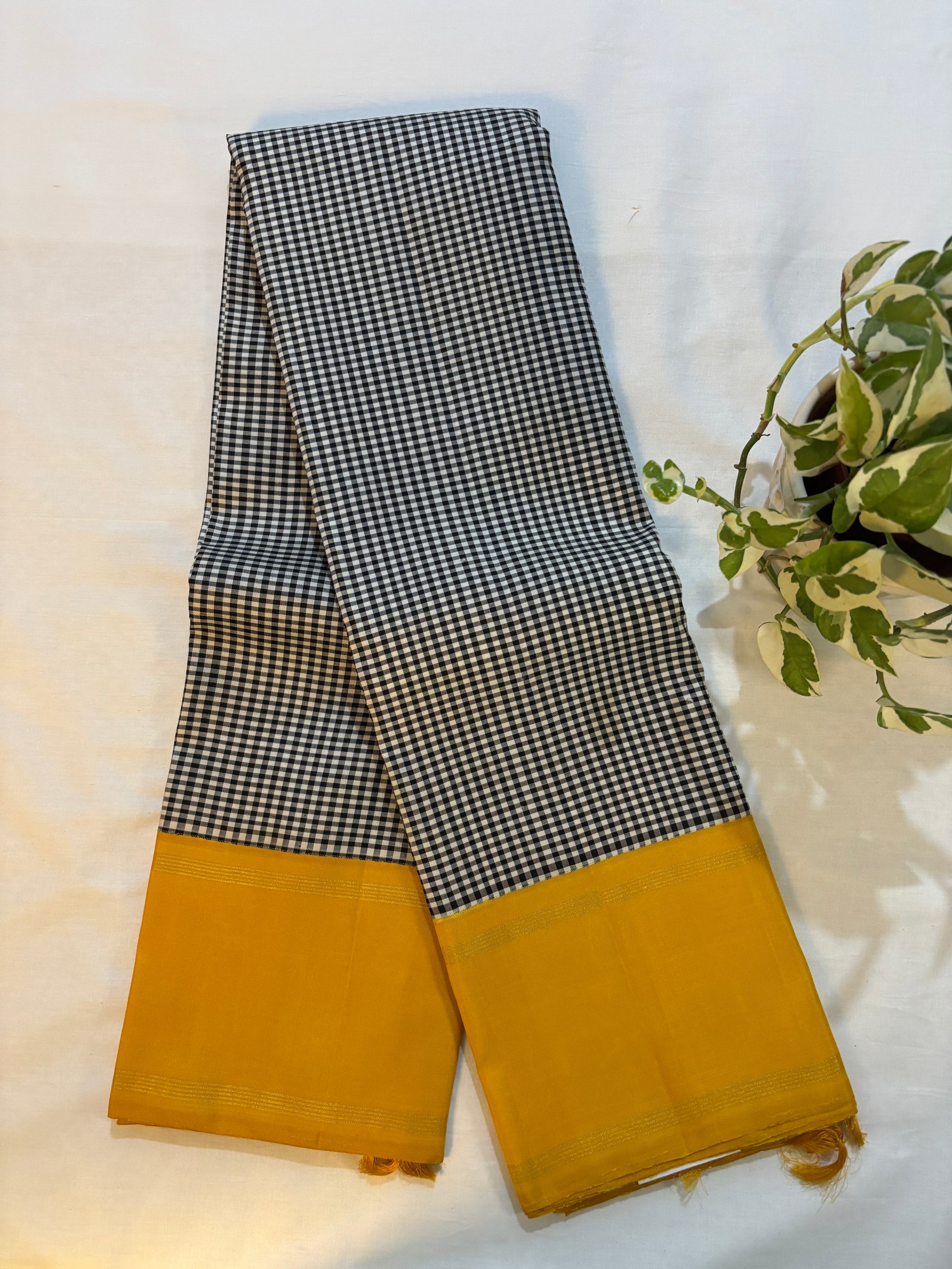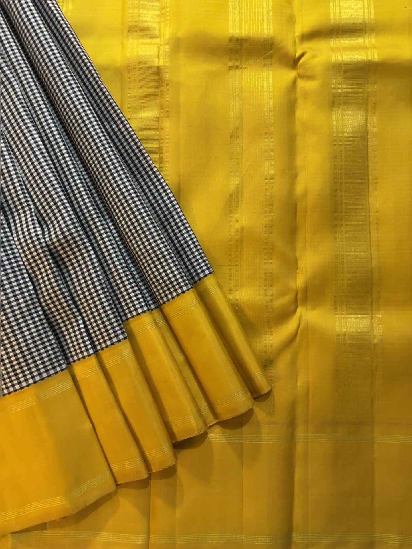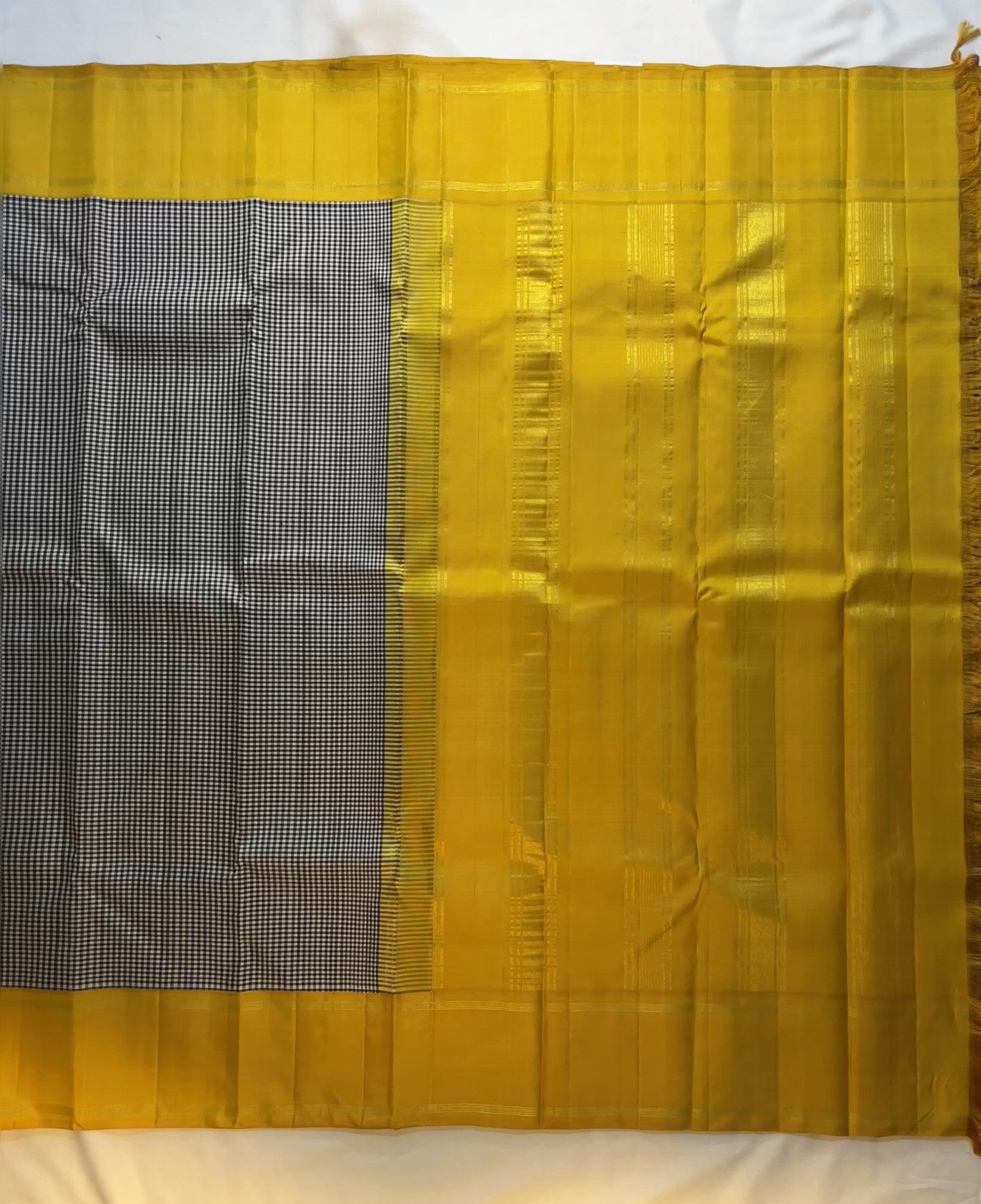 A stunning Kanchi silk drape with timeless black and white checks, elevated by a radiant yellow border and pallu. A perfect harmony of elegance and vibrance