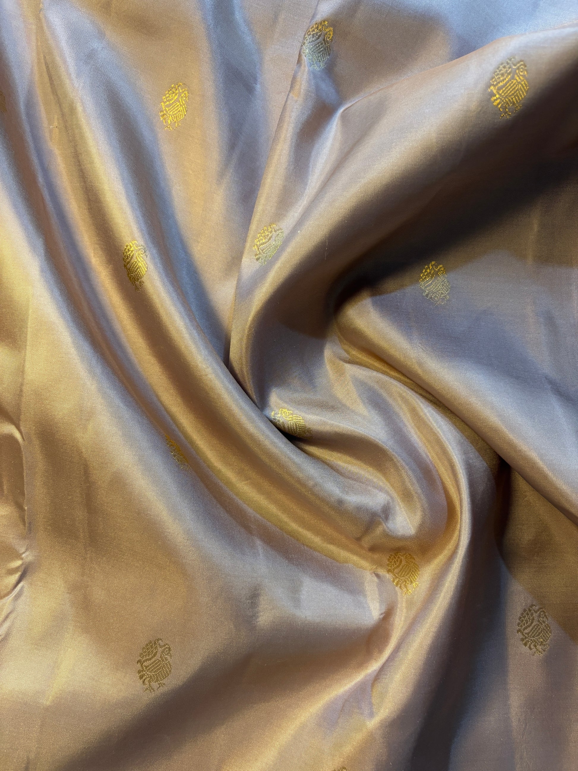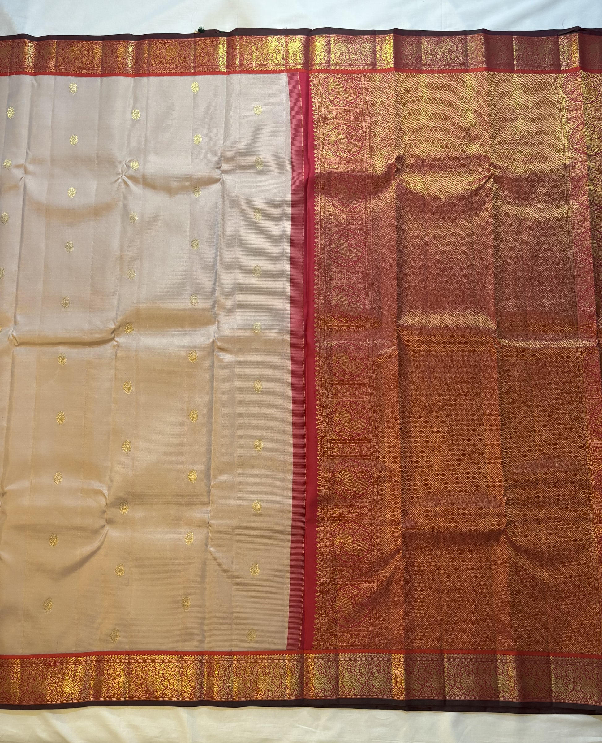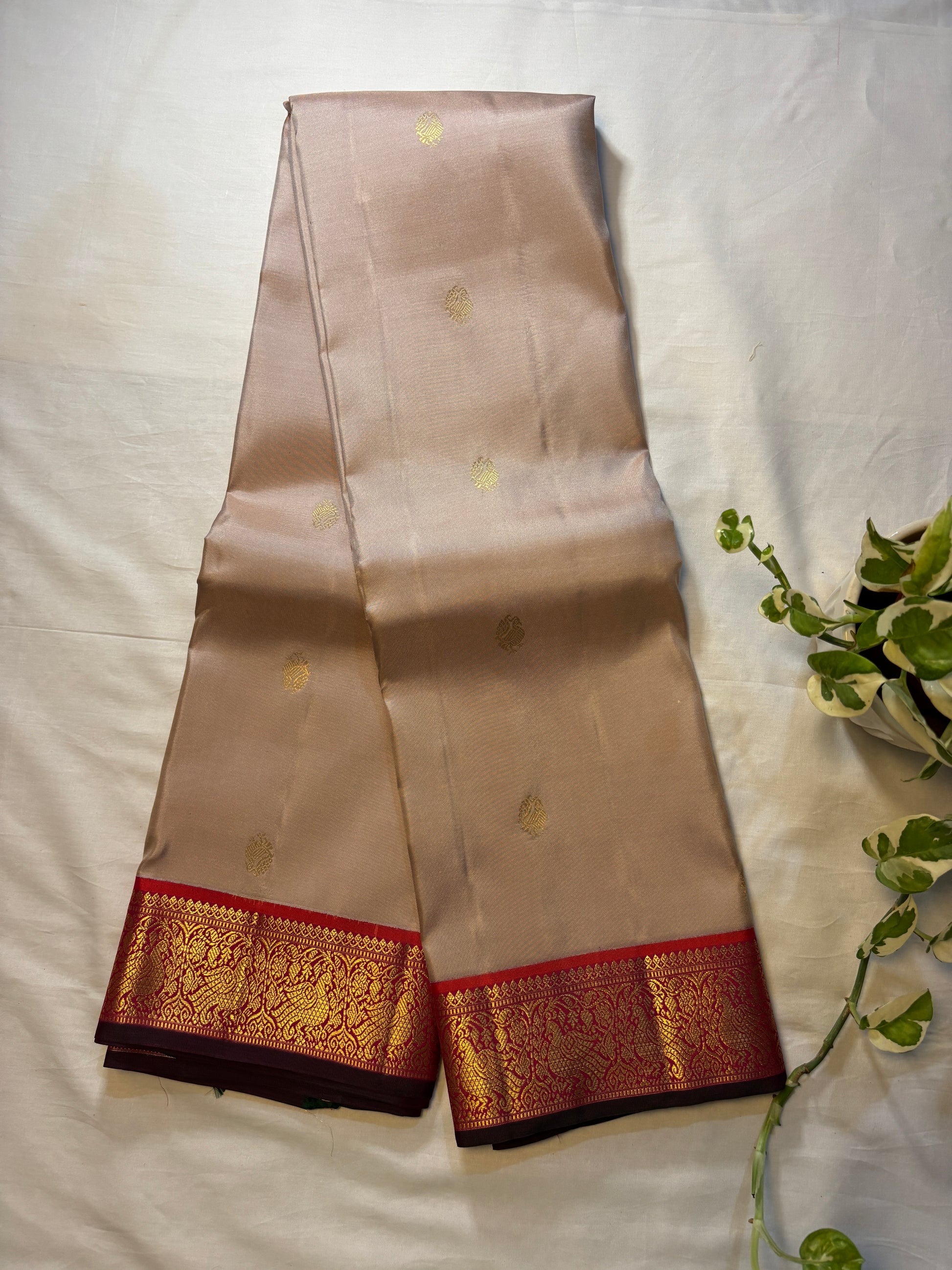 Kanjivaram Silk saree - muted beige/stone grey with delicate golden buttas throughout the bod and a rich maroon-red border and pallu with intricate zari work.