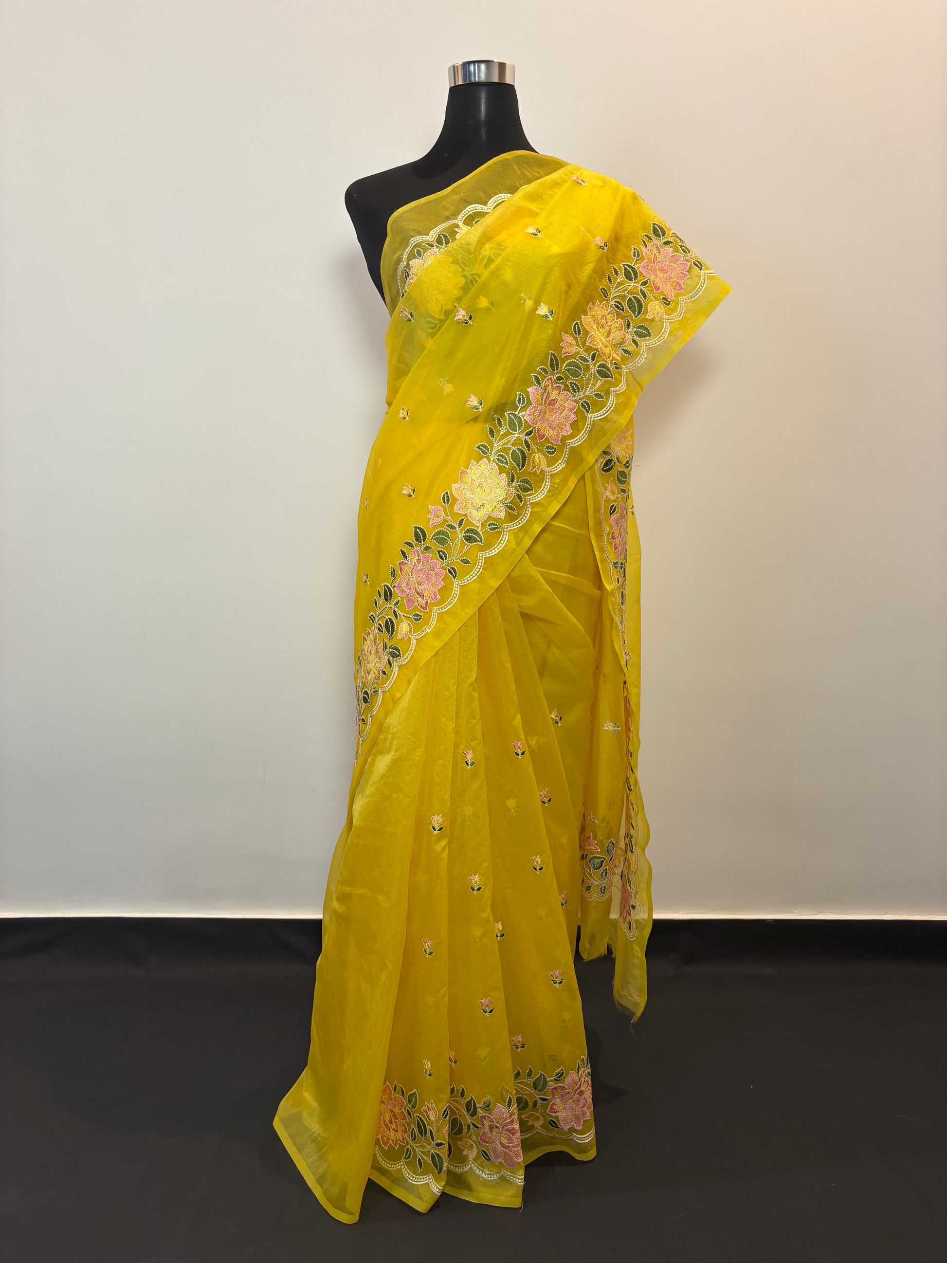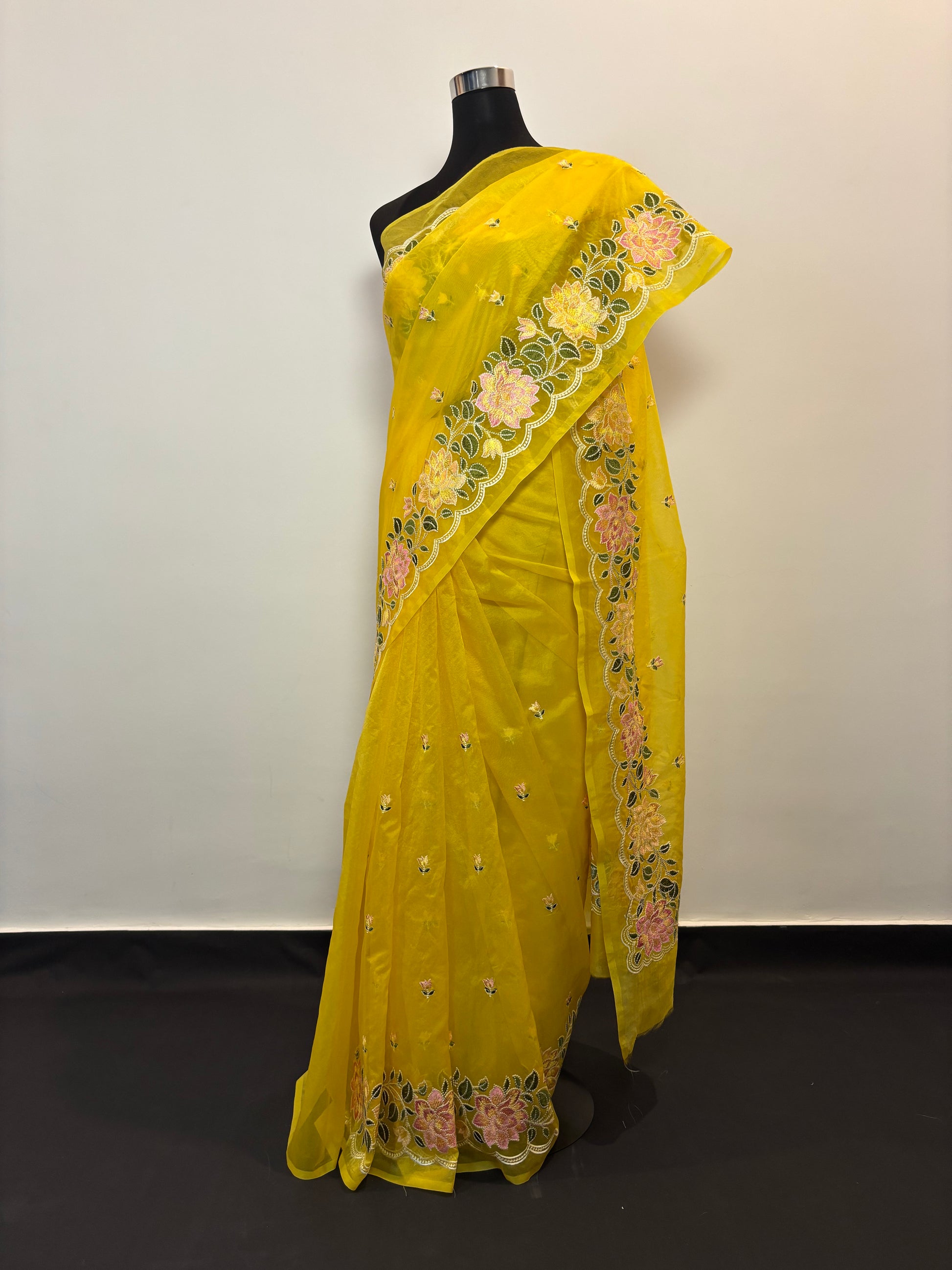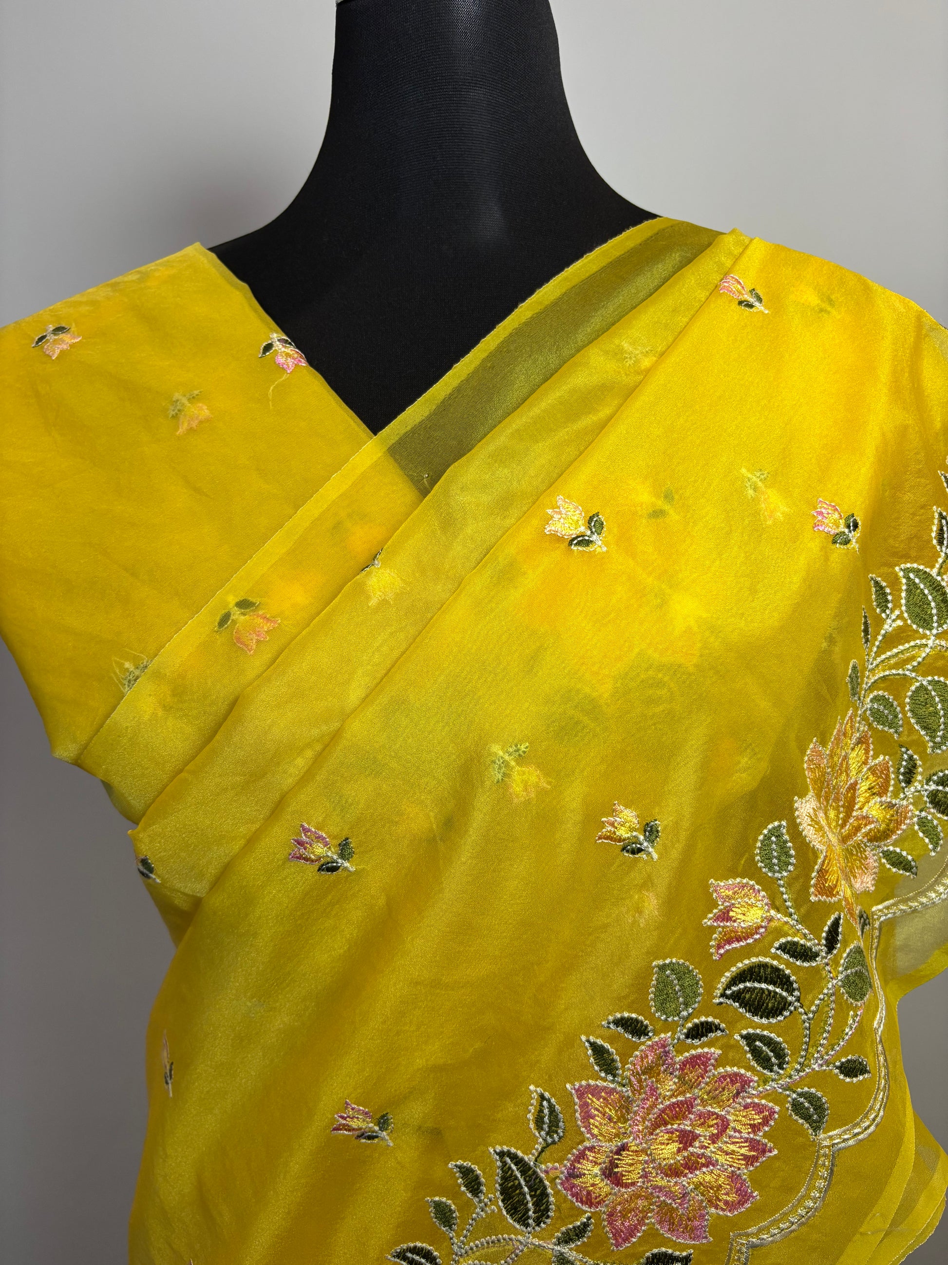 Yellow organza saree is all about subtle charm and timeless beauty. Adorned with delicate embroidery that catches the light just right