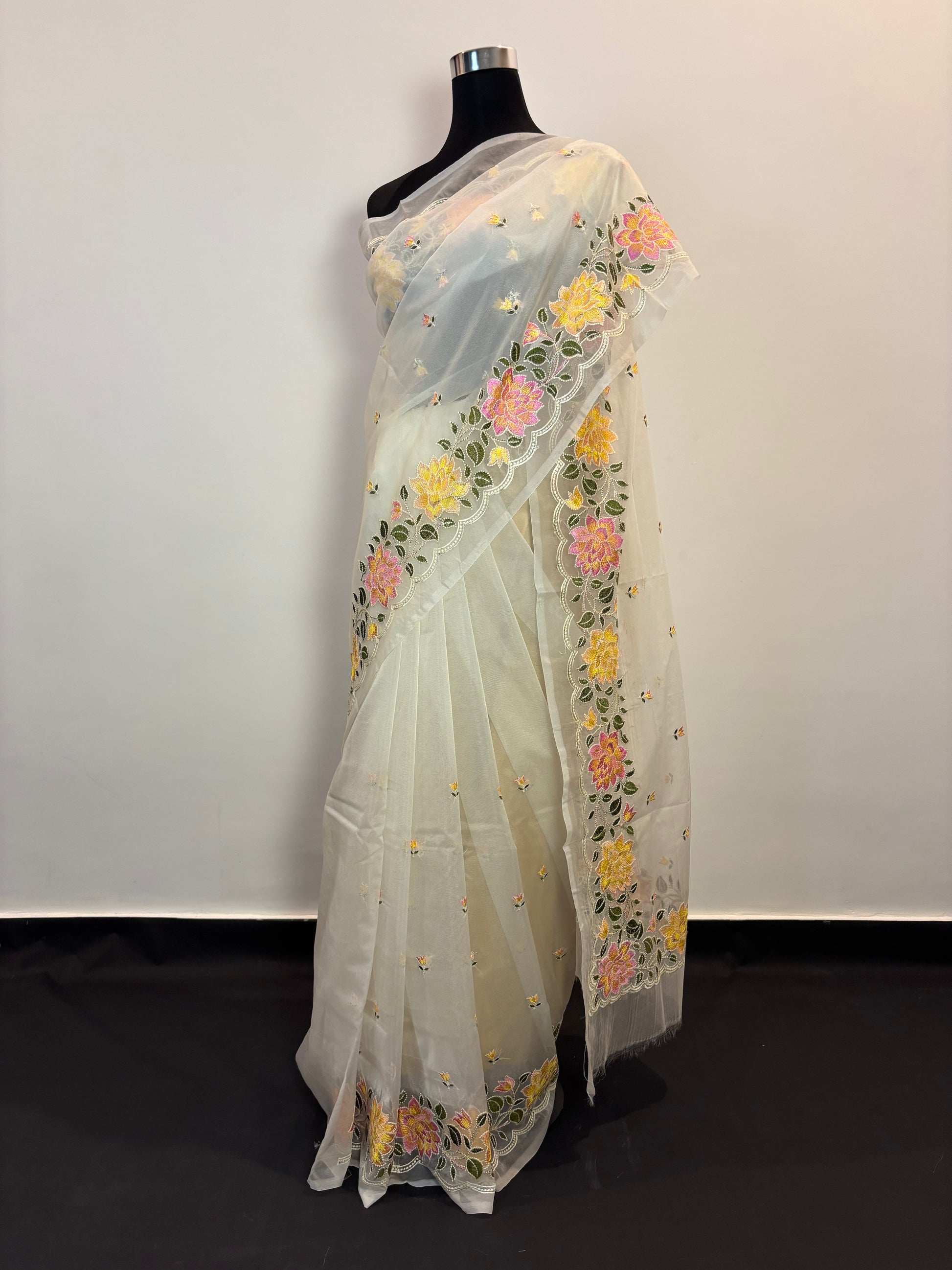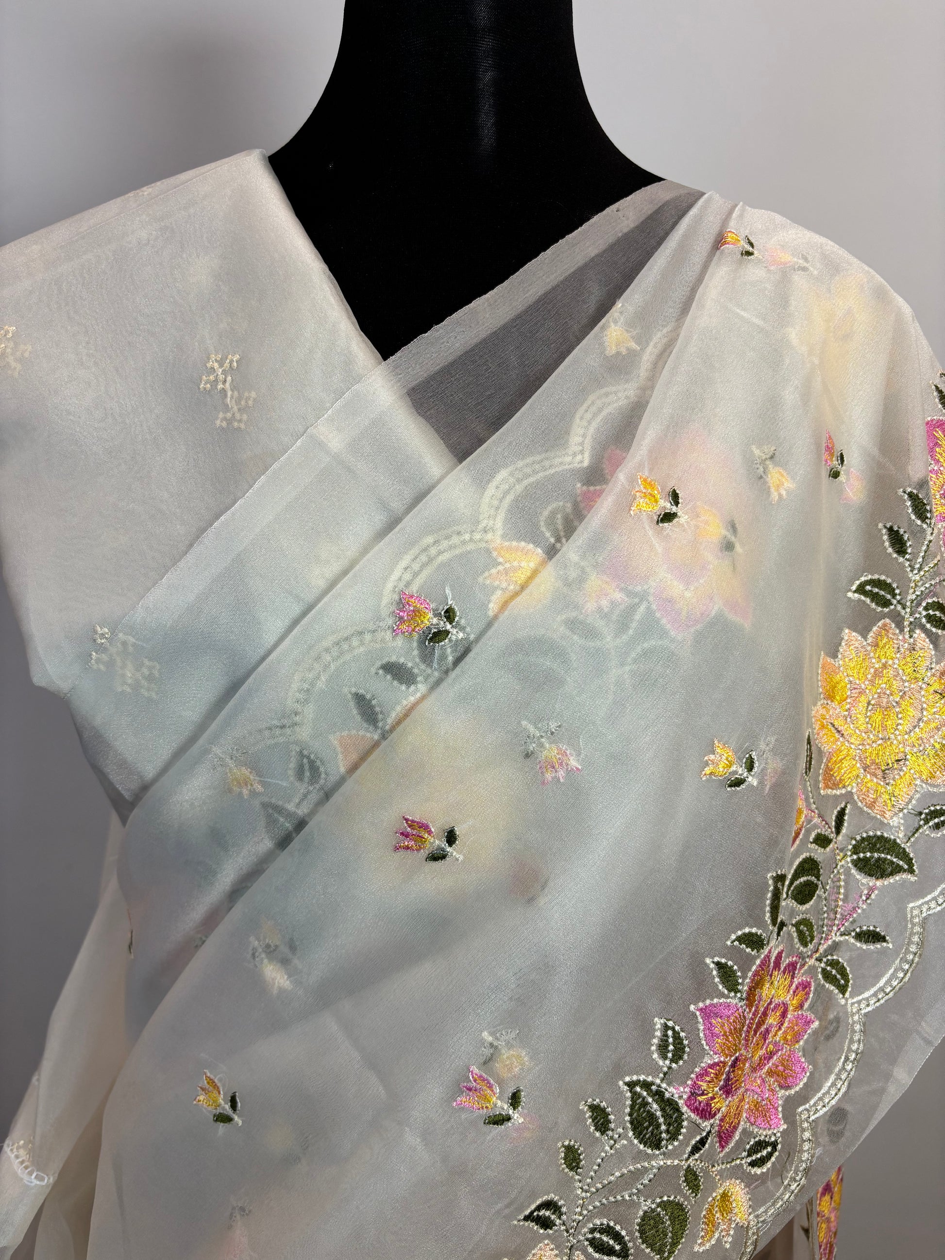 Beige organza saree is all about subtle charm and timeless beauty. Adorned with delicate embroidery that catches the light just right