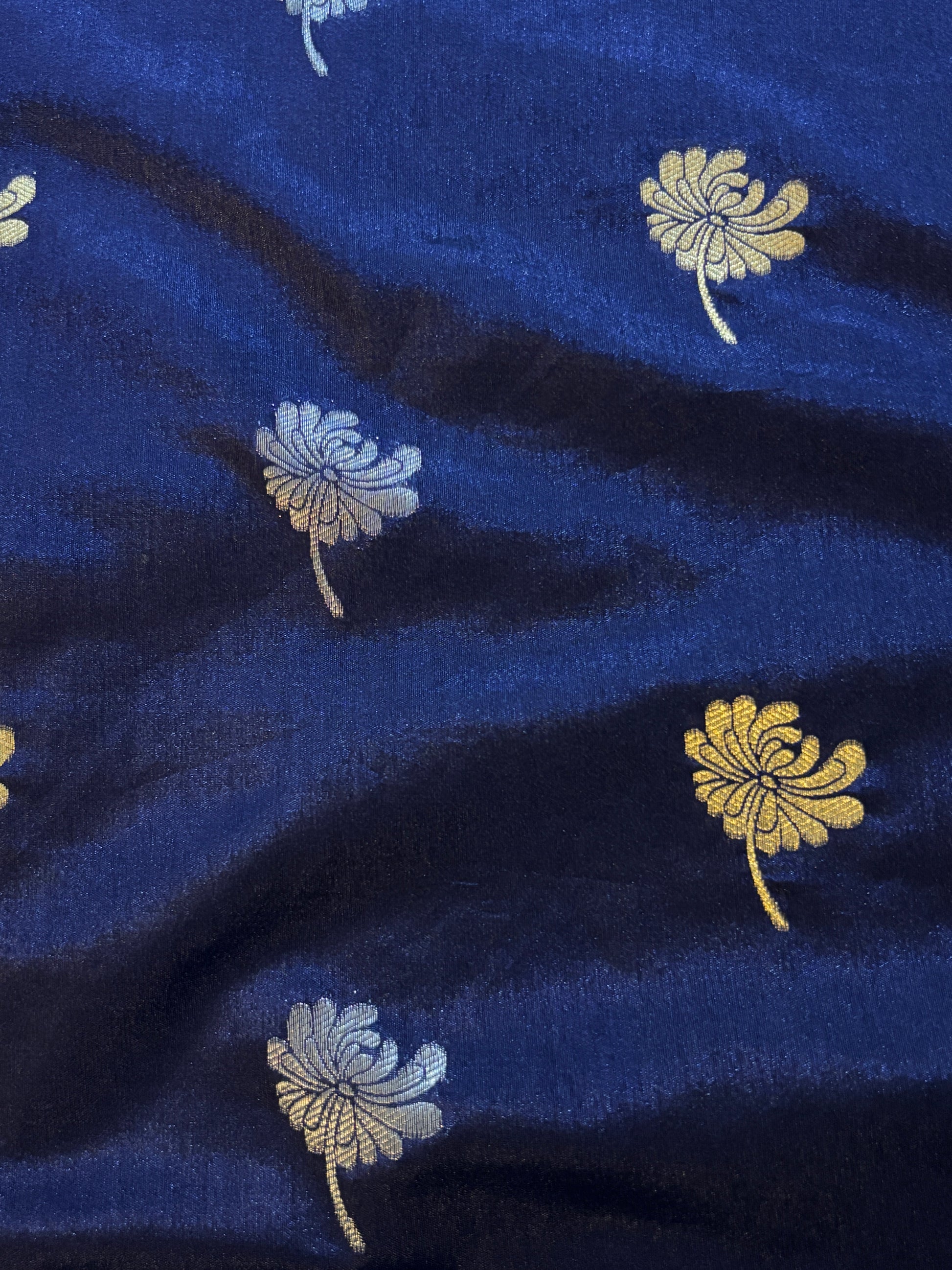 Semi Tussar Silk, these sarees come in deep jewel tones of green, navy, and black, beautifully adorned with golden and silver floral zari motifs.