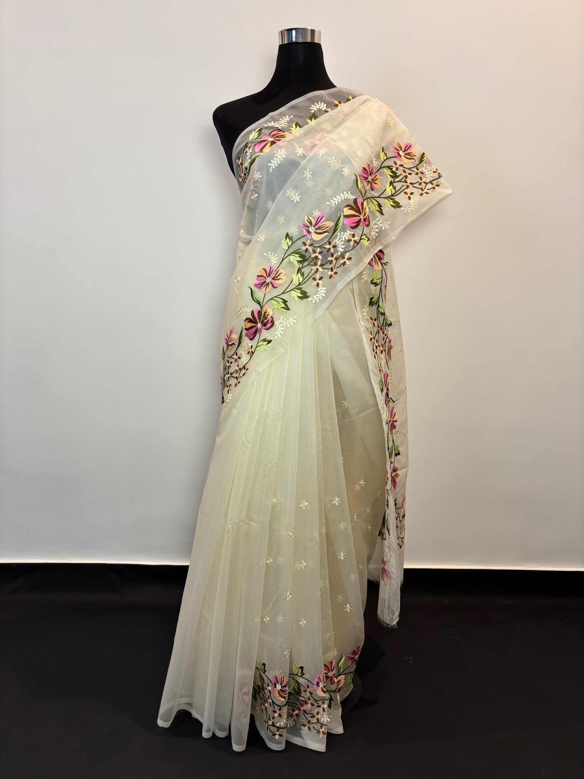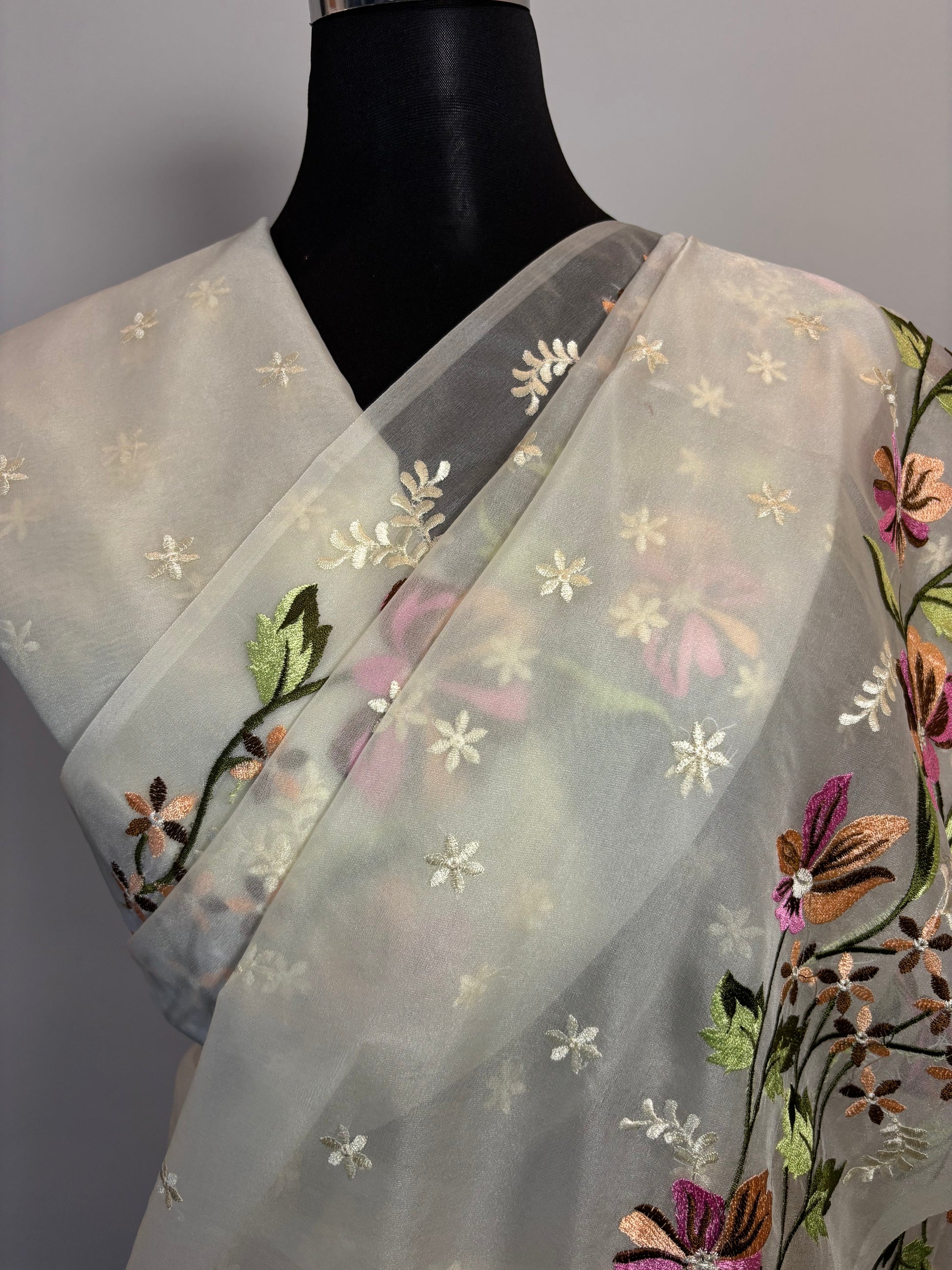 Beige organza saree is all about subtle charm and timeless beauty. Adorned with delicate embroidery that catches the light just right.