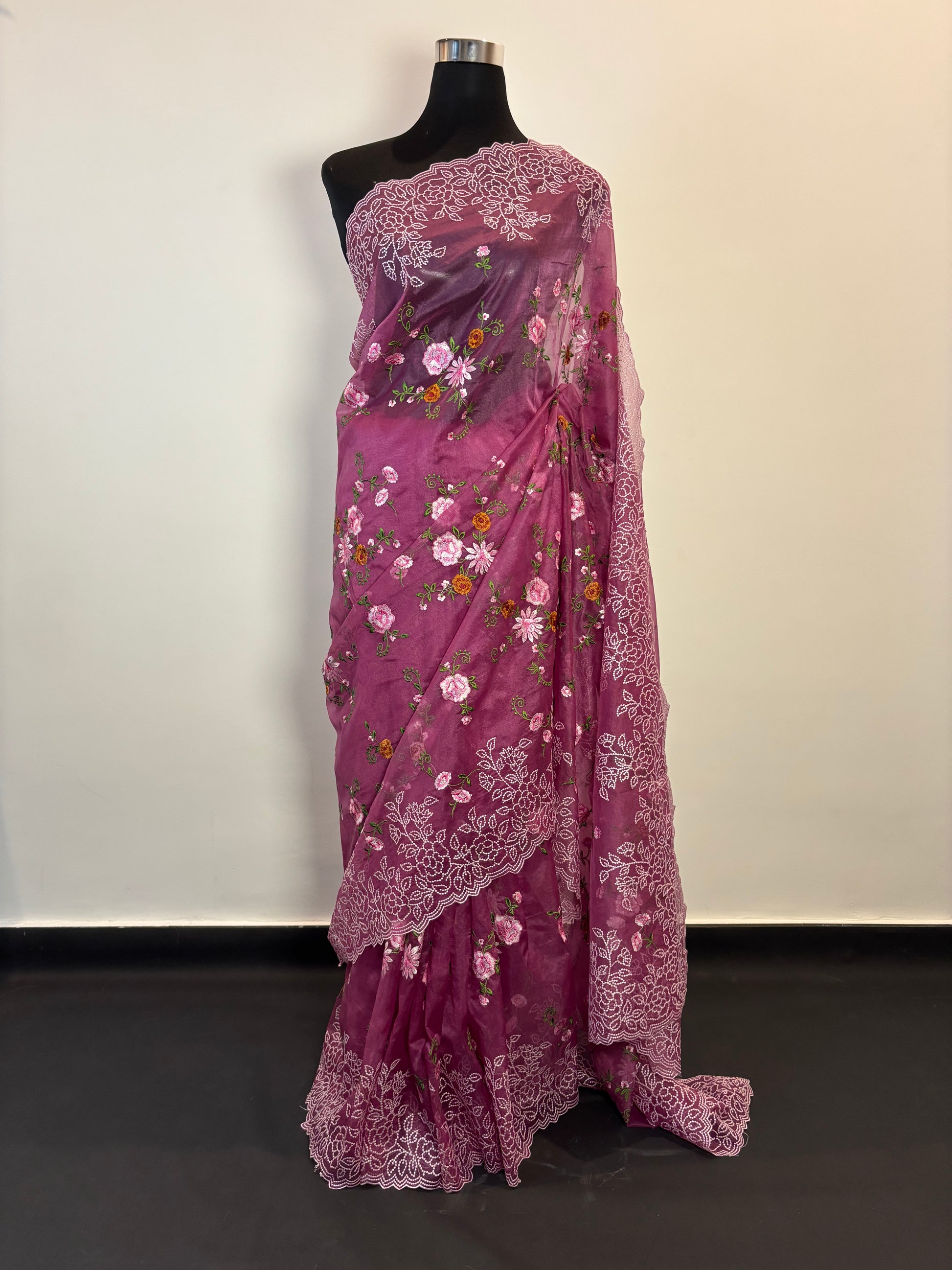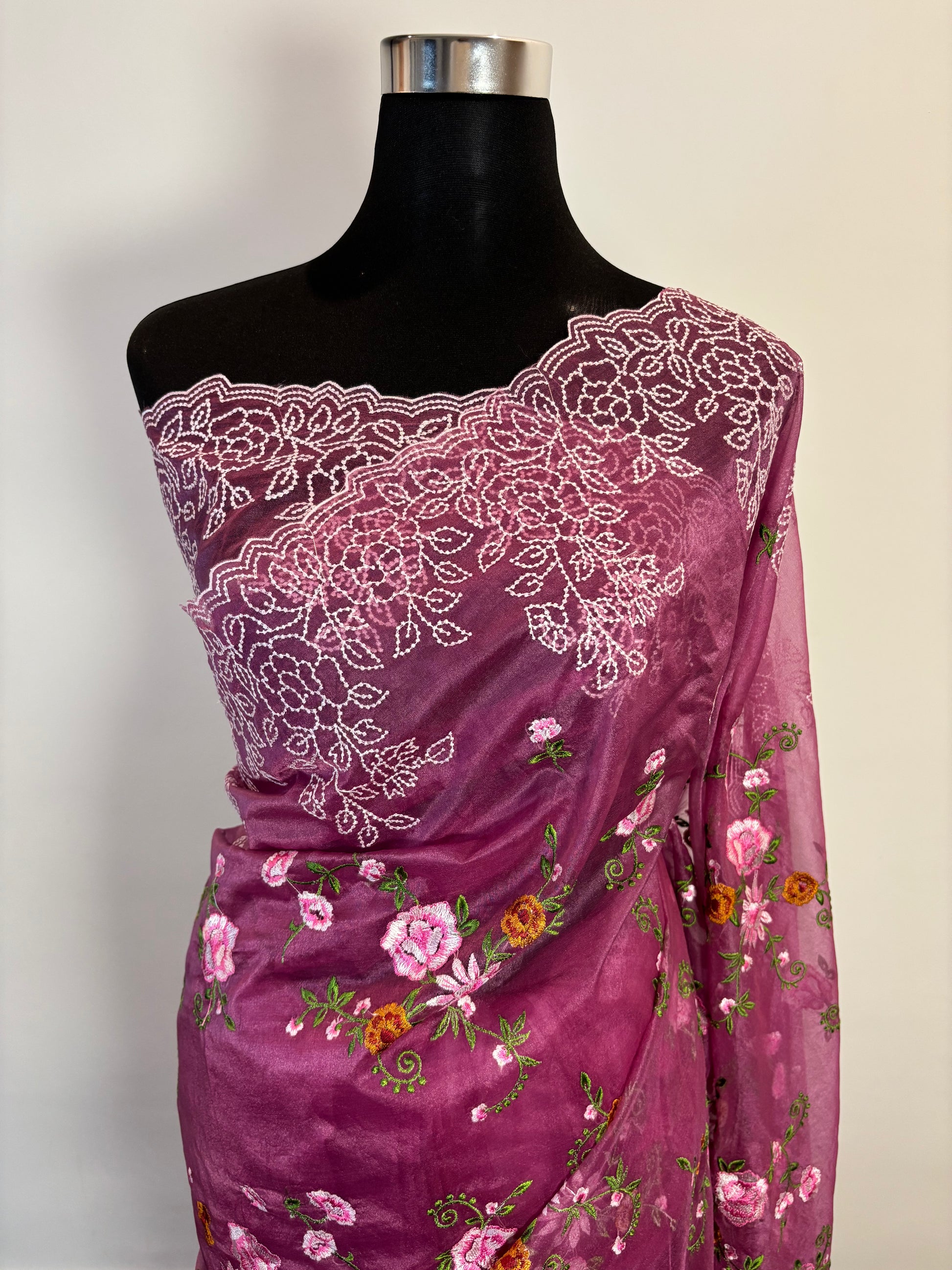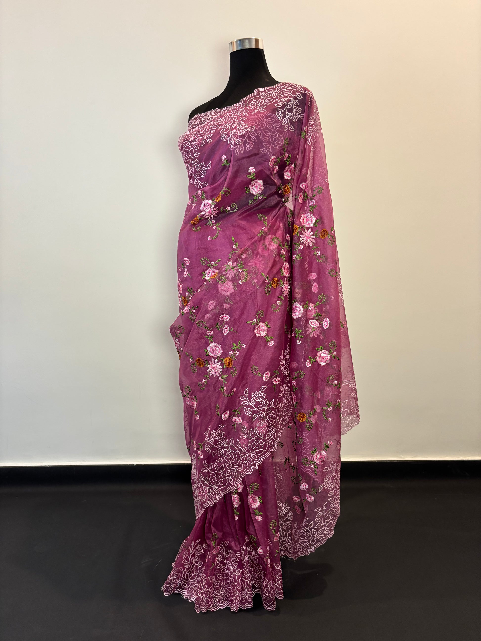 Plum shade organza saree is all about subtle charm and timeless beauty. Adorned with delicate embroidery that catches the light just right