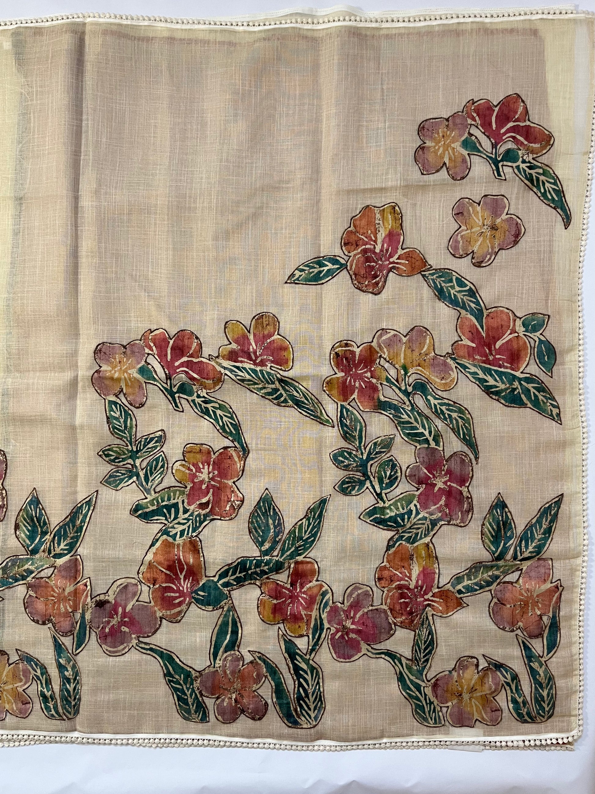 Fabric: Linen Tussar tissue, Floral applique work with stitched detailing, Light & breezy