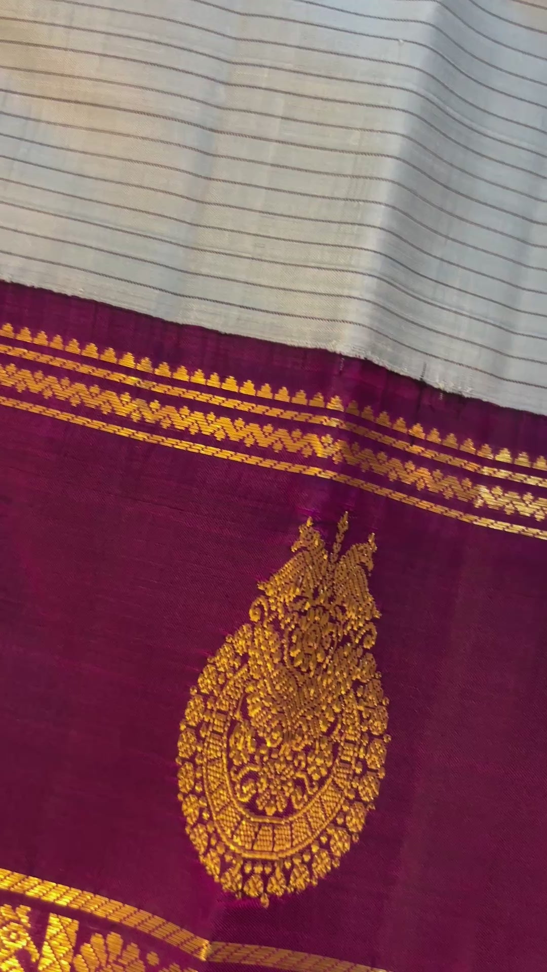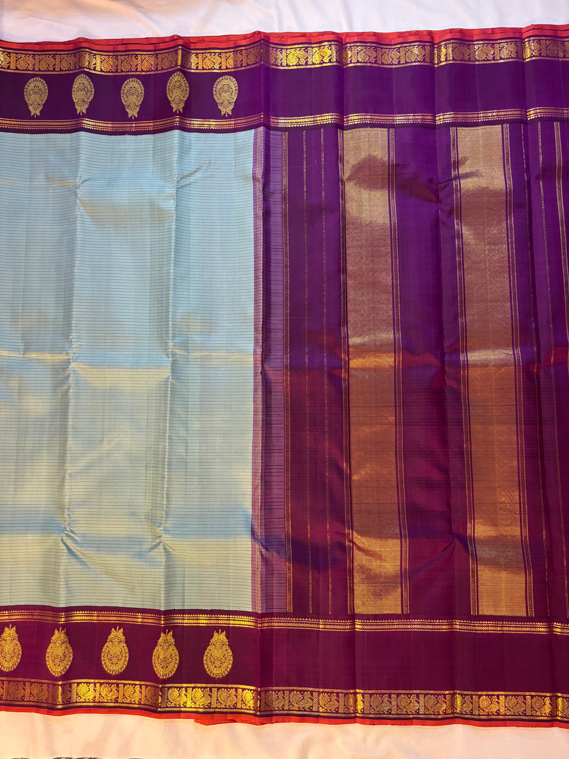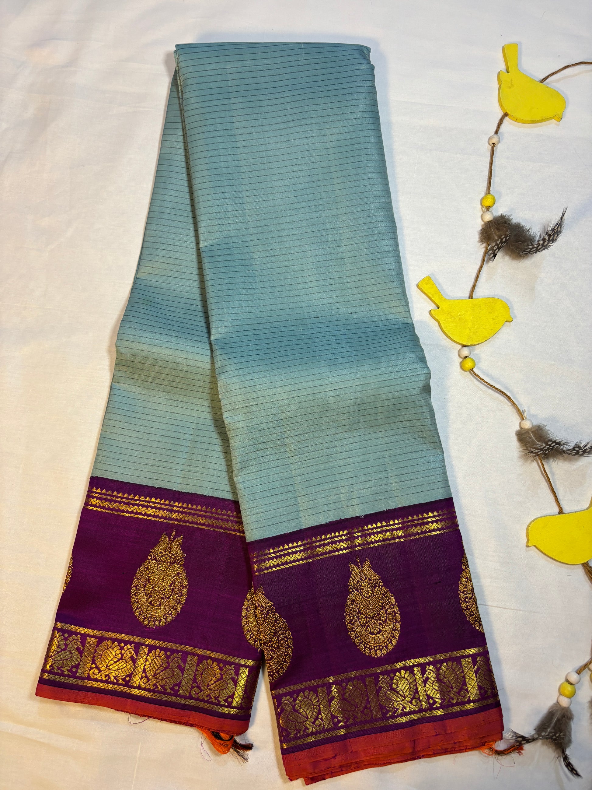 Graceful mint green silk saree with subtle stripes, beautifully paired with a rich purple border featuring intricate gold zari motifs. Finished with a touch of red edging