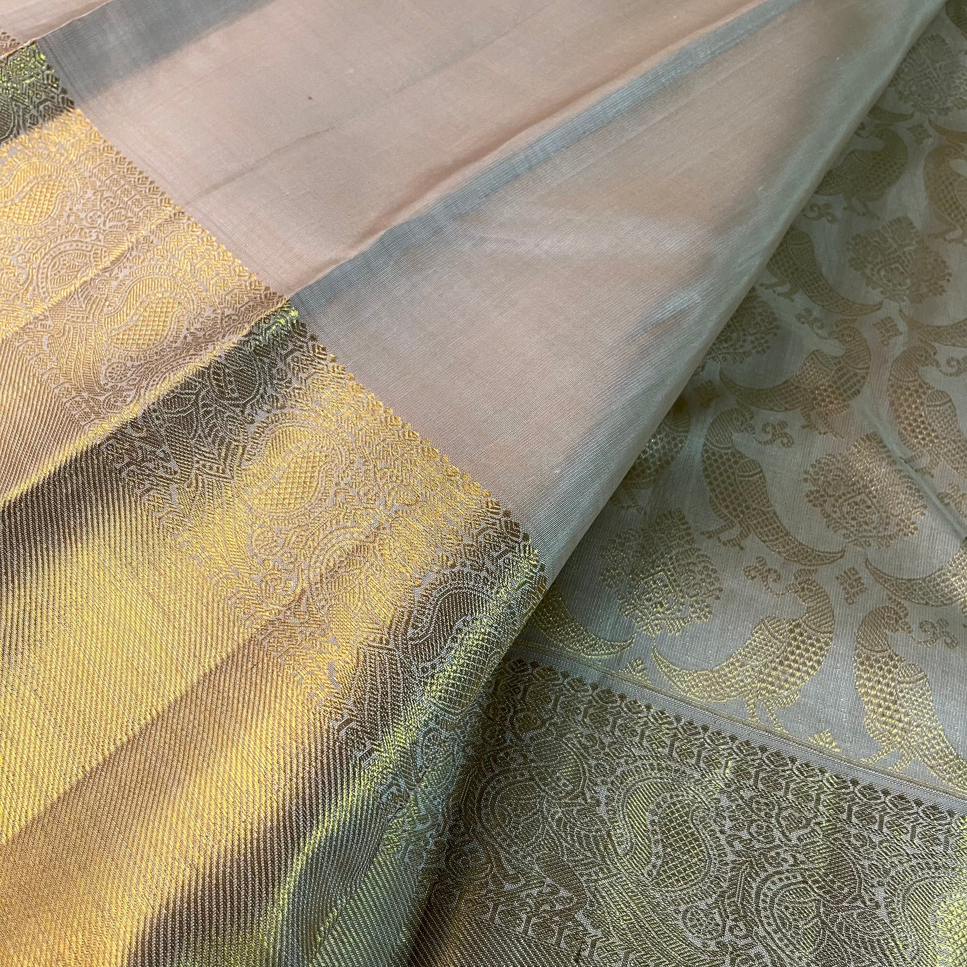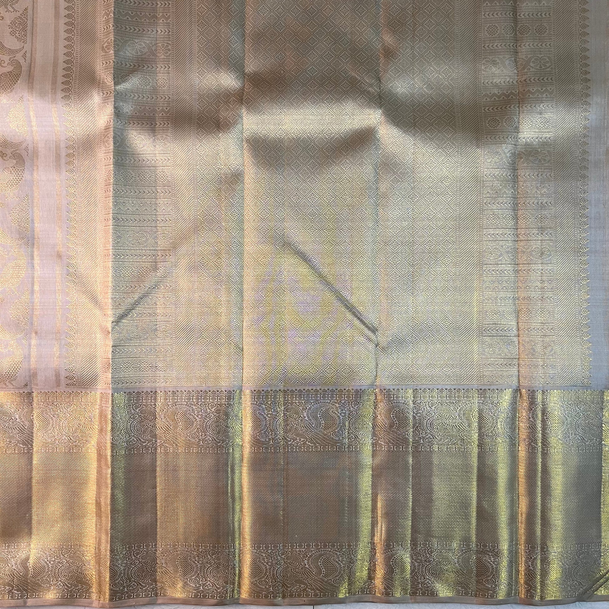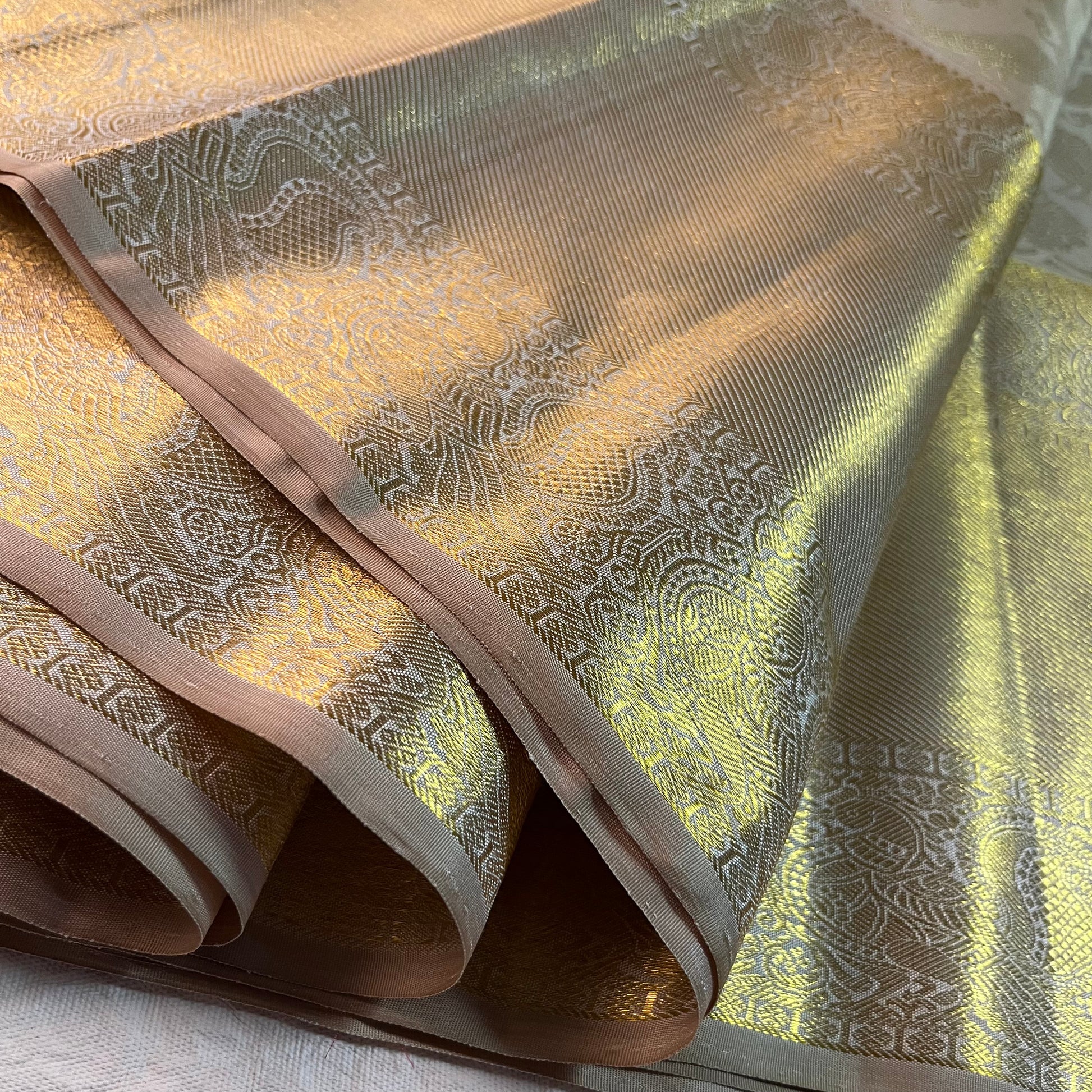 A magnificent gold & silver zari silk saree exuding opulence, adorned with intricate zari weaving and a lustrous finish—perfect for making a regal statement at weddings or grand celebrations.