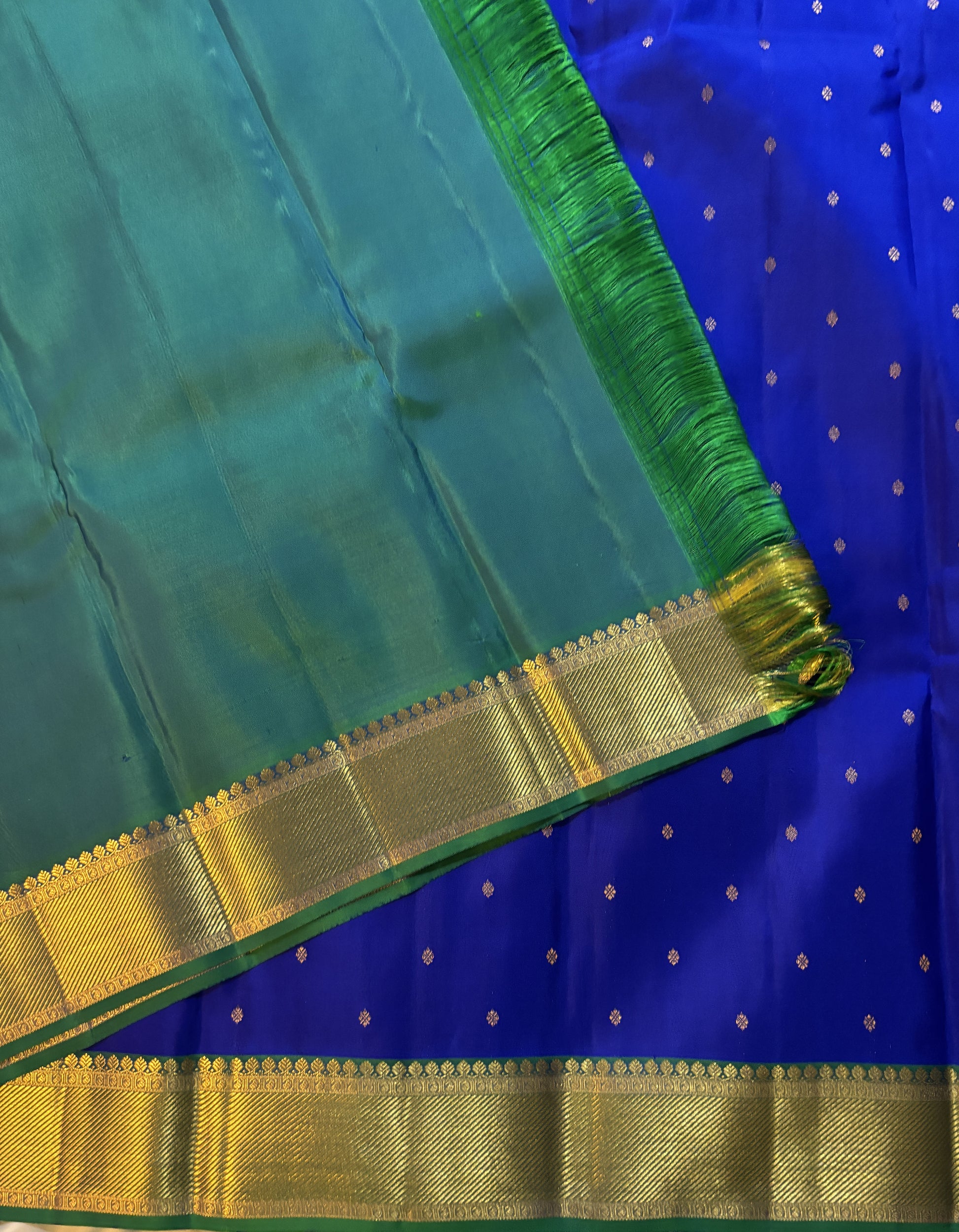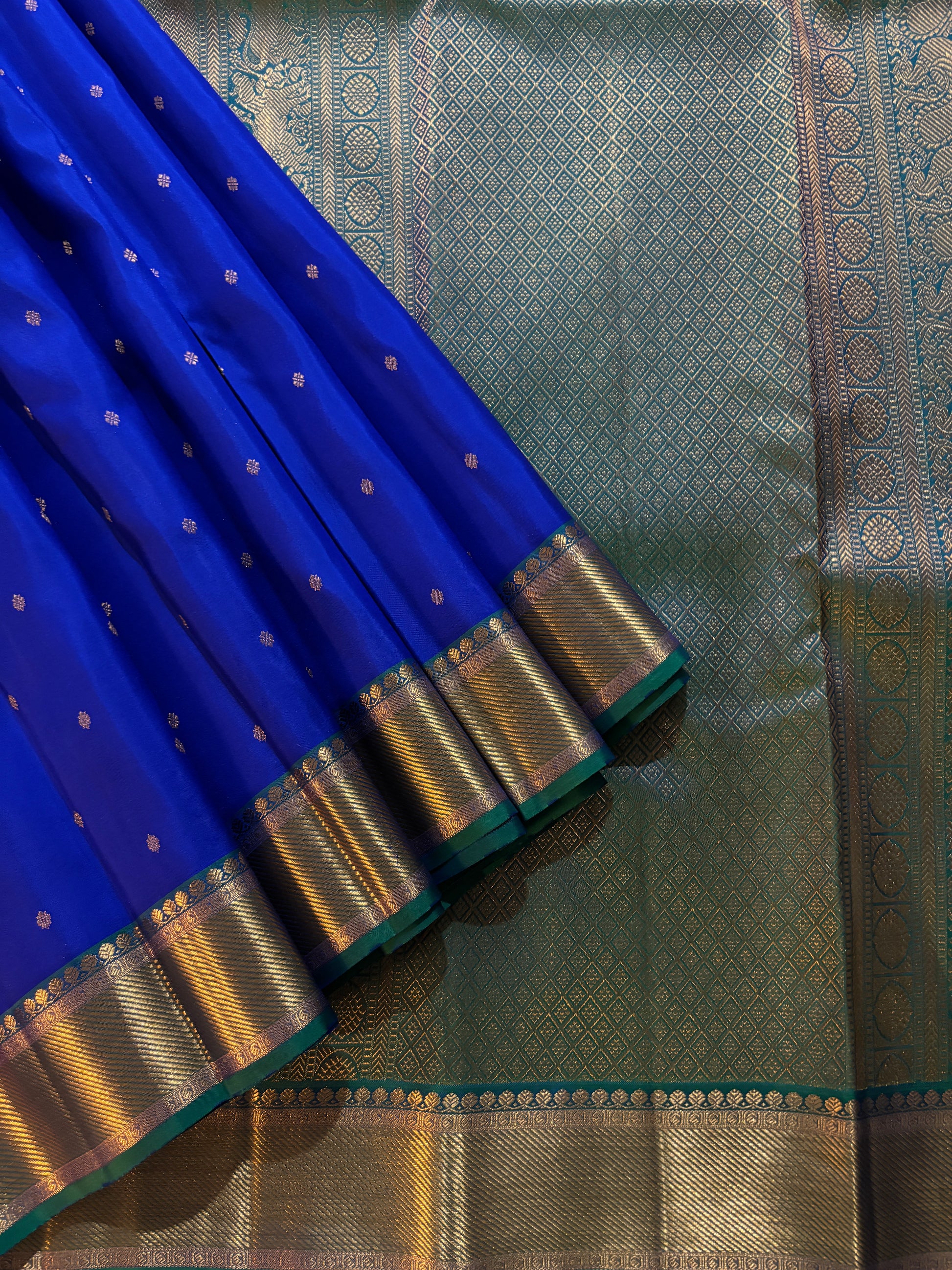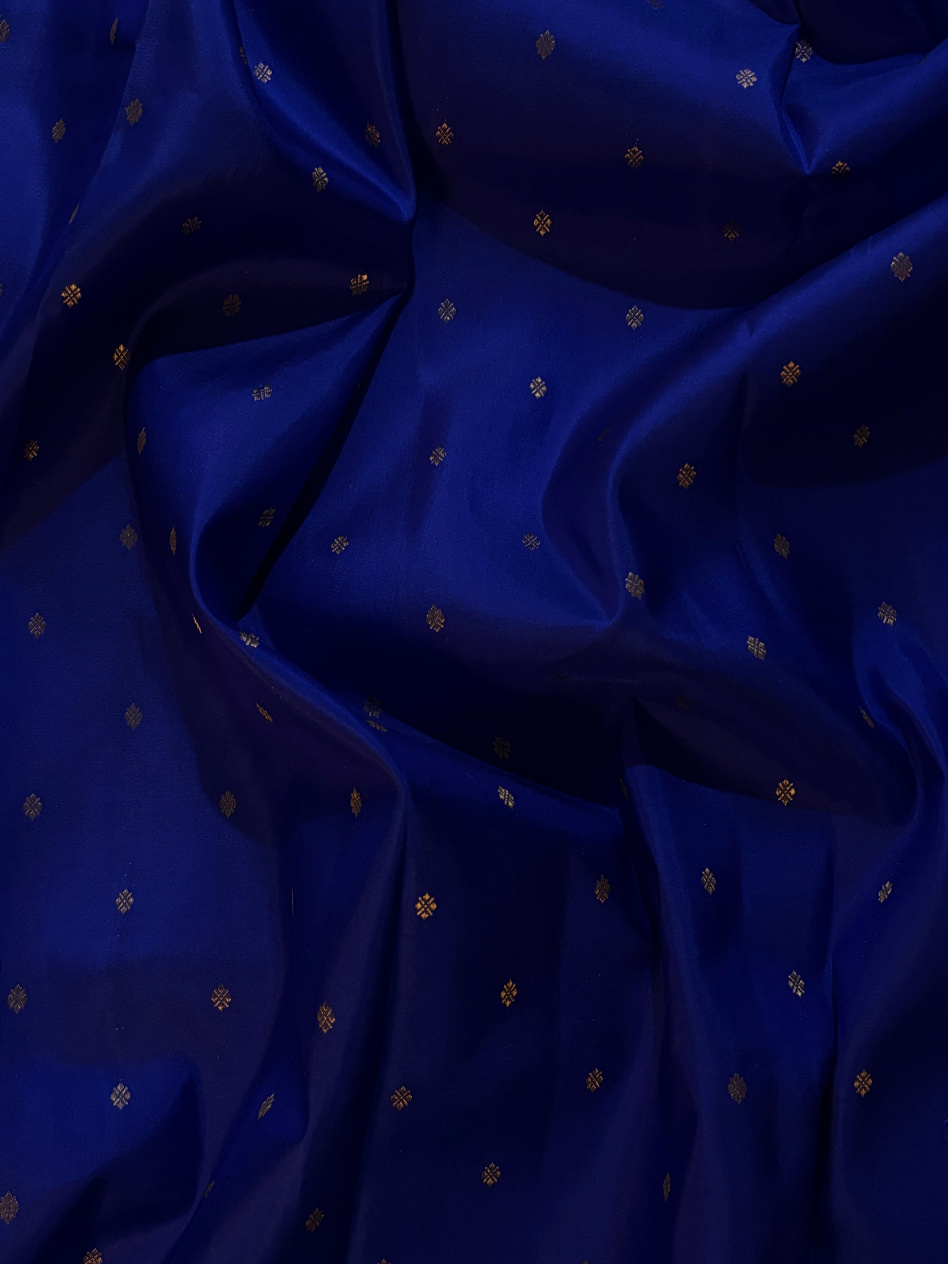 Make a timeless statement in this rich royal blue Kanjivaram silk saree, adorned with delicate gold buttas all over the body. The grand zari pallu is a masterpiece, featuring intricate peacock and floral motifs woven in gold zari, adding a majestic touch to your look.