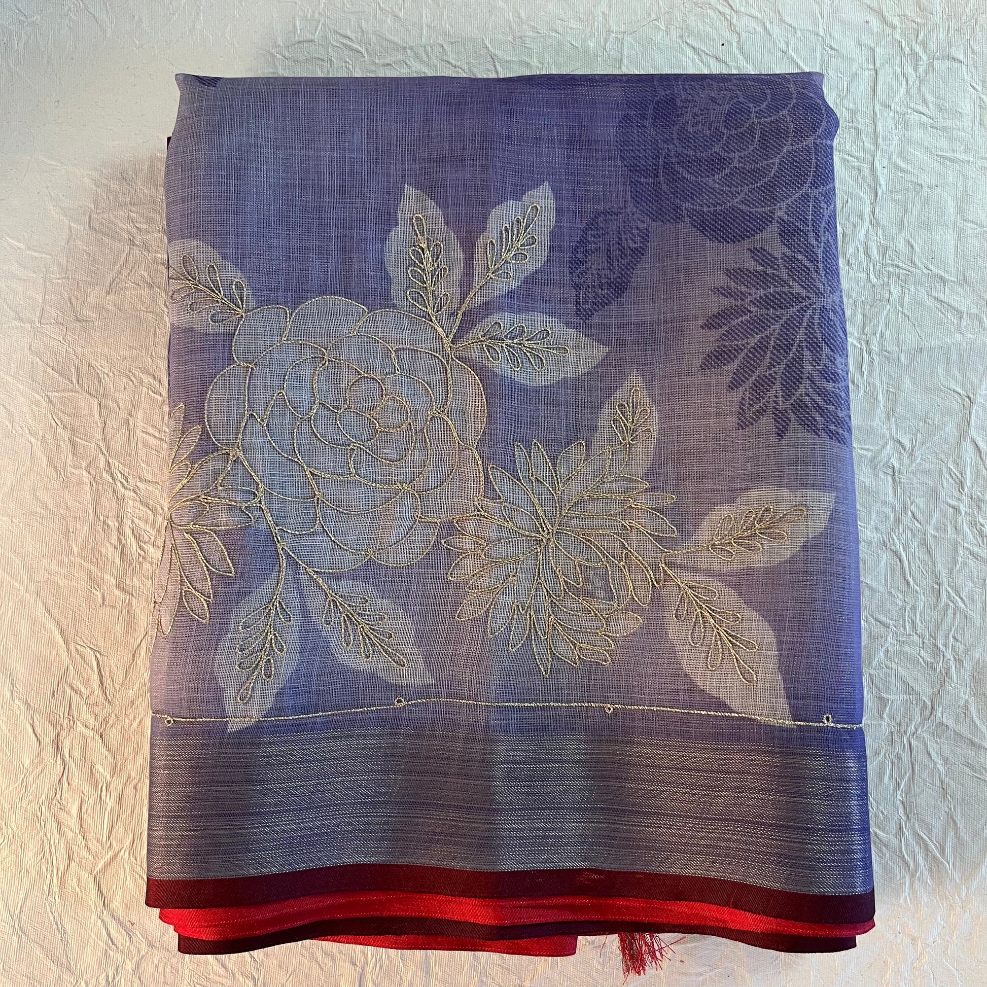 Graceful painted linen saree in a soft blend pastel tones.The saree features beautifully detailed rose motifs with Zari boarder
