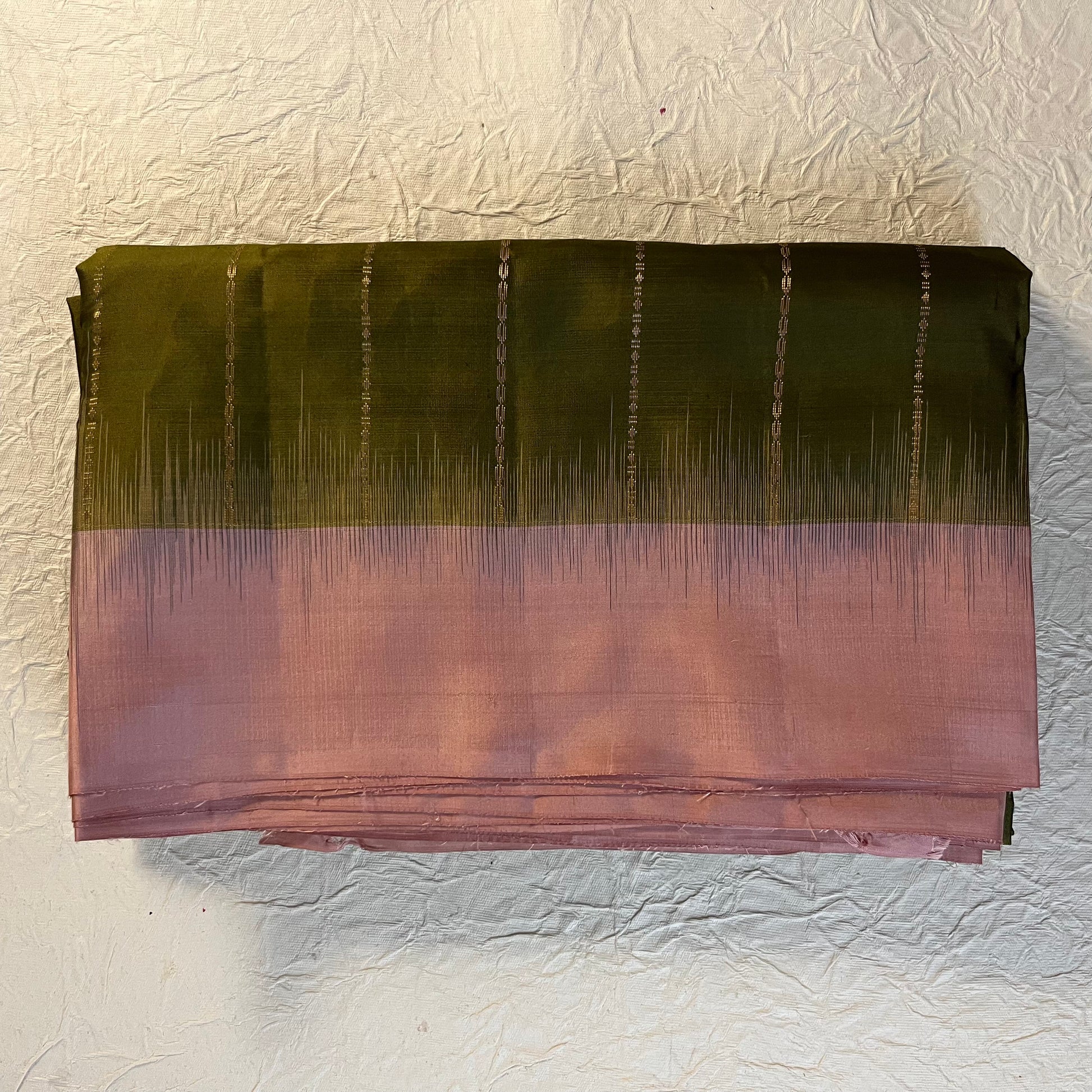Elegant olive green soft silk saree with subtle vertical zari lines, paired with a soft blush pink border for a graceful contrast.